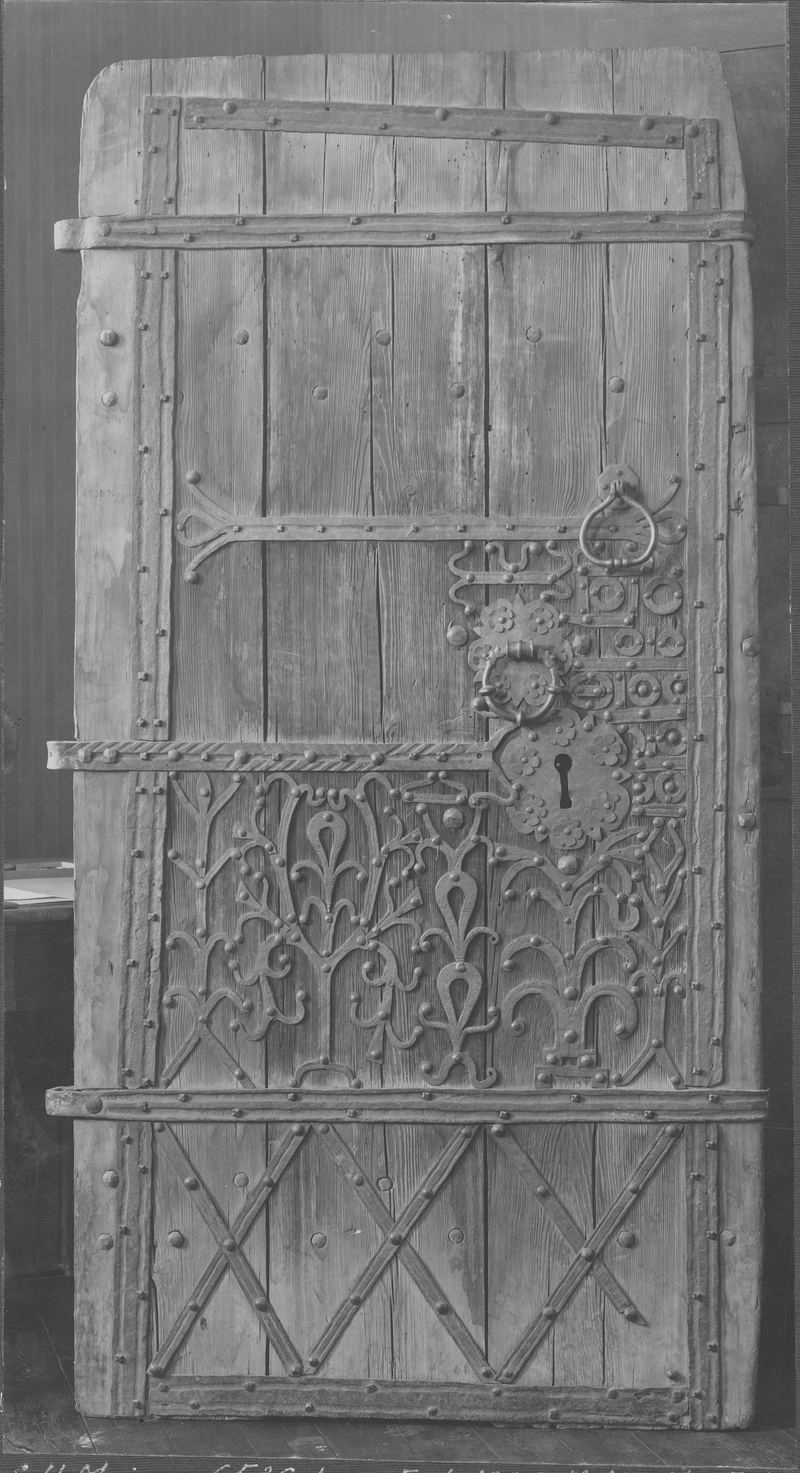 Beskrivning: Medeltida järnsmidd dörr från gamla kyrkan, nu Historiska museet.