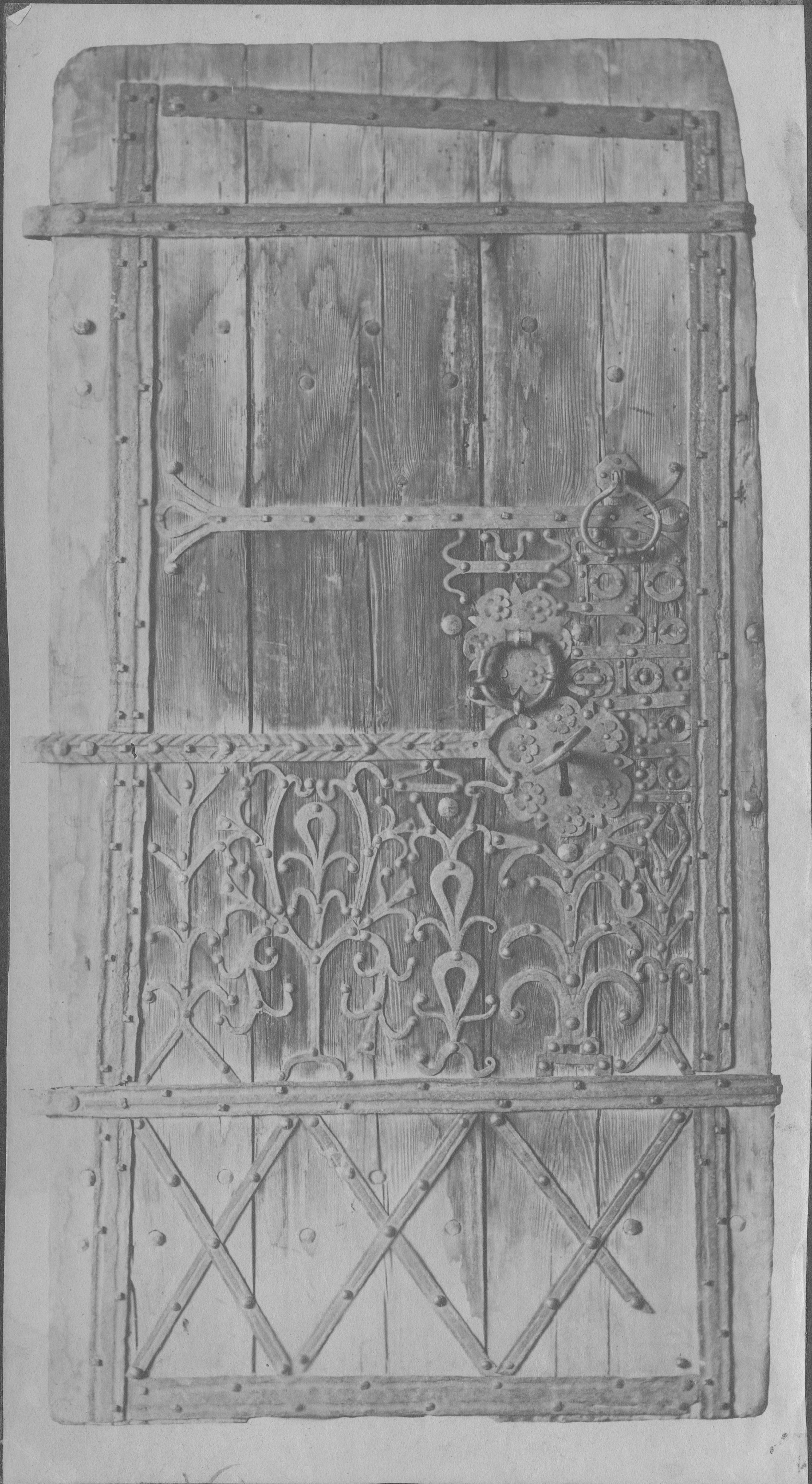 Beskrivning: Medeltida järnsmidd dörr från gamla kyrkan, nu Historiska museet.