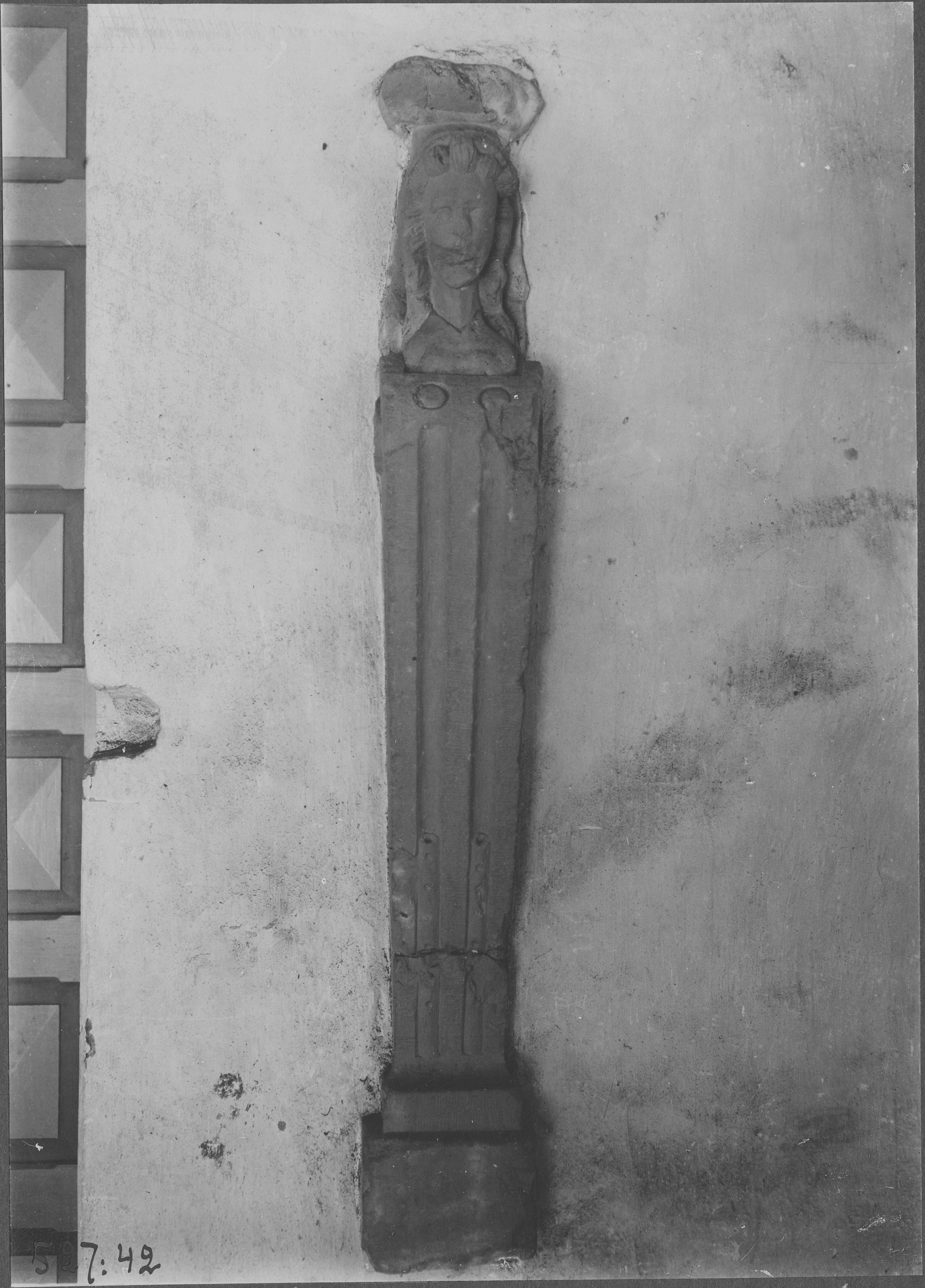 Beskrivning: Kvinnlig herm av kalksten från den äldre västportalen, från 1662, nu i vapenhuset.
