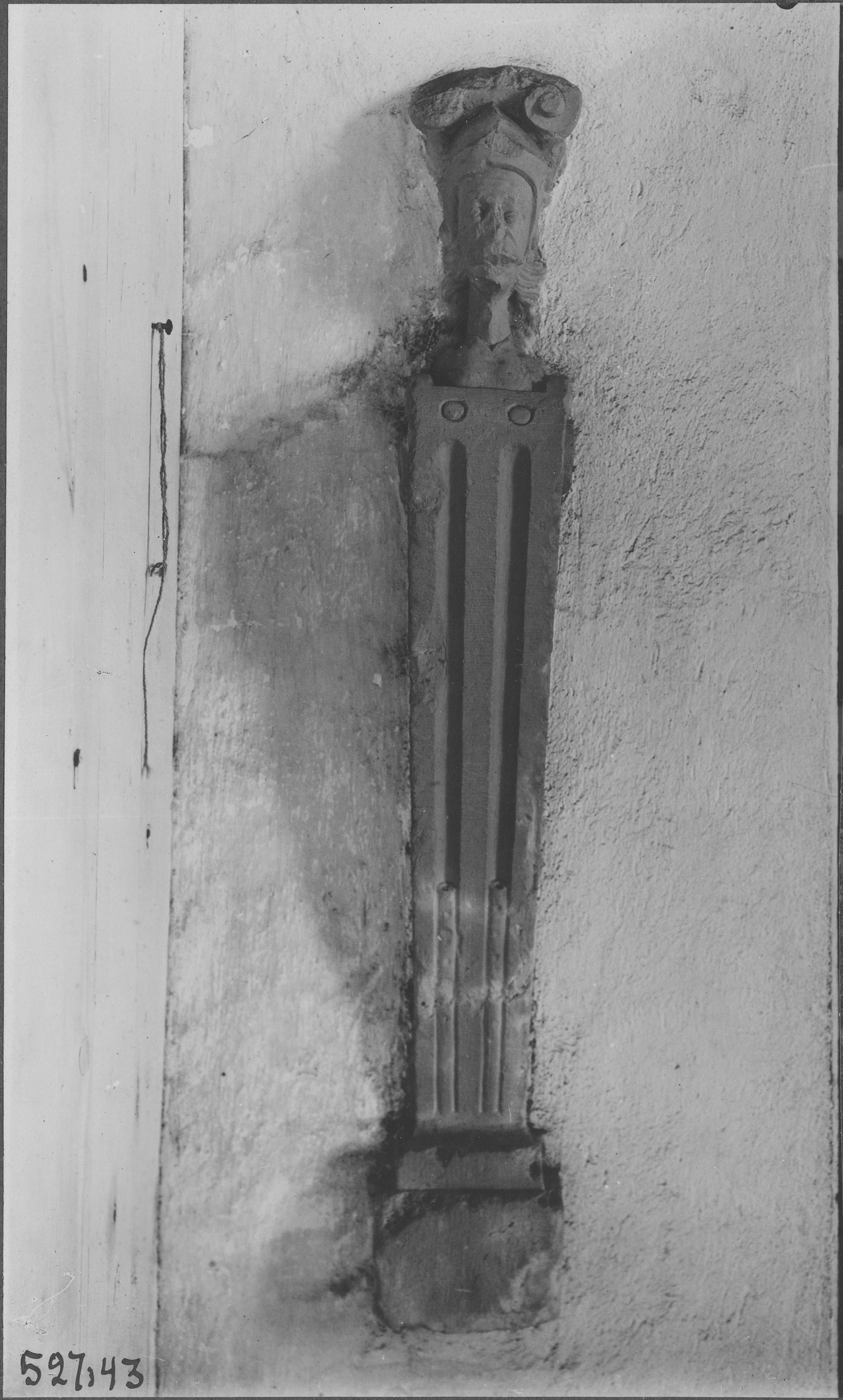 Beskrivning: Man/krigare som herm av kalksten från den äldre västportalen, från 1662, nu i vapenhuset.