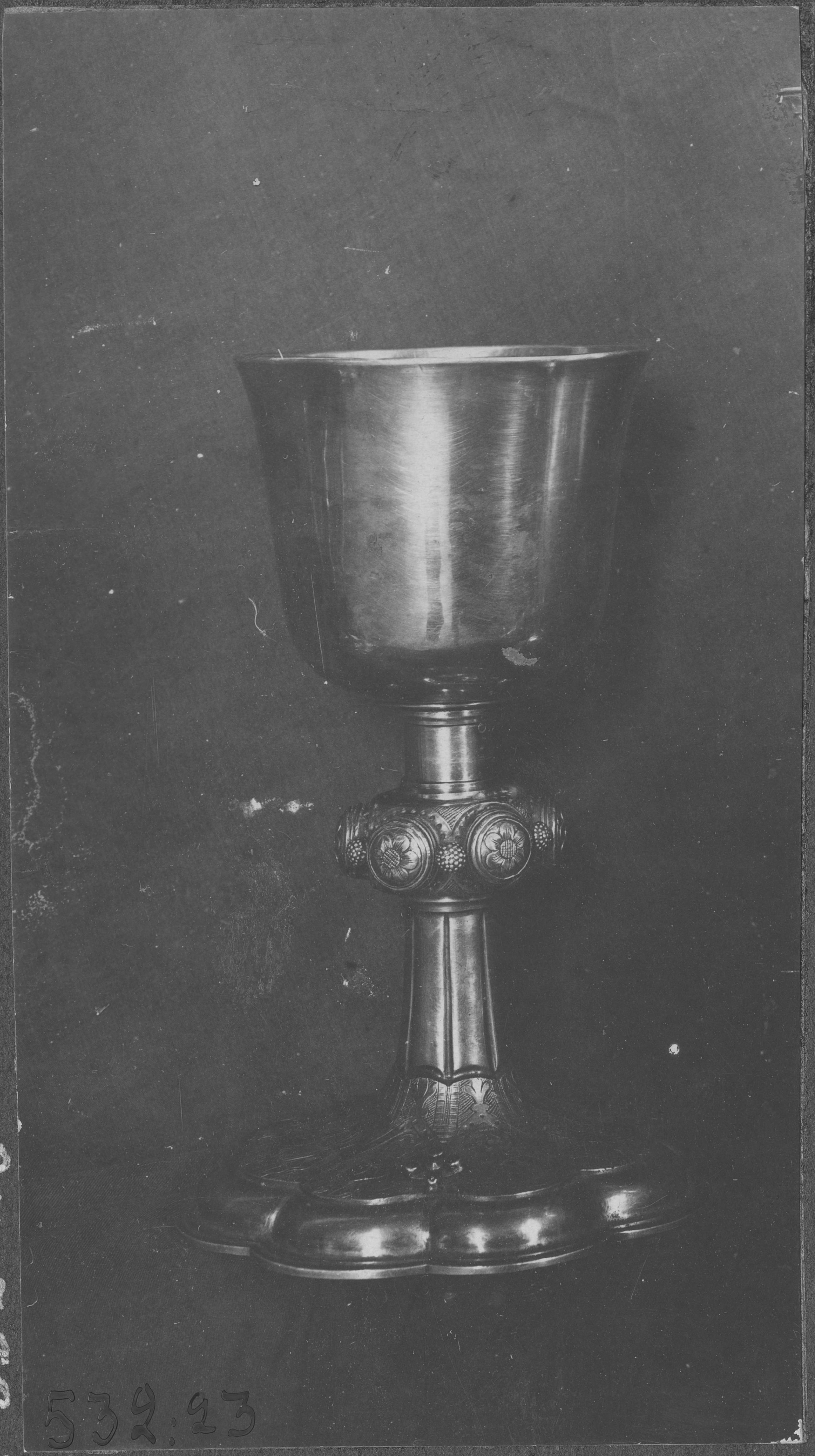 Beskrivning: Kalk av förgyllt silver från 1300-talet - skålen (cuppan) från 1748.
