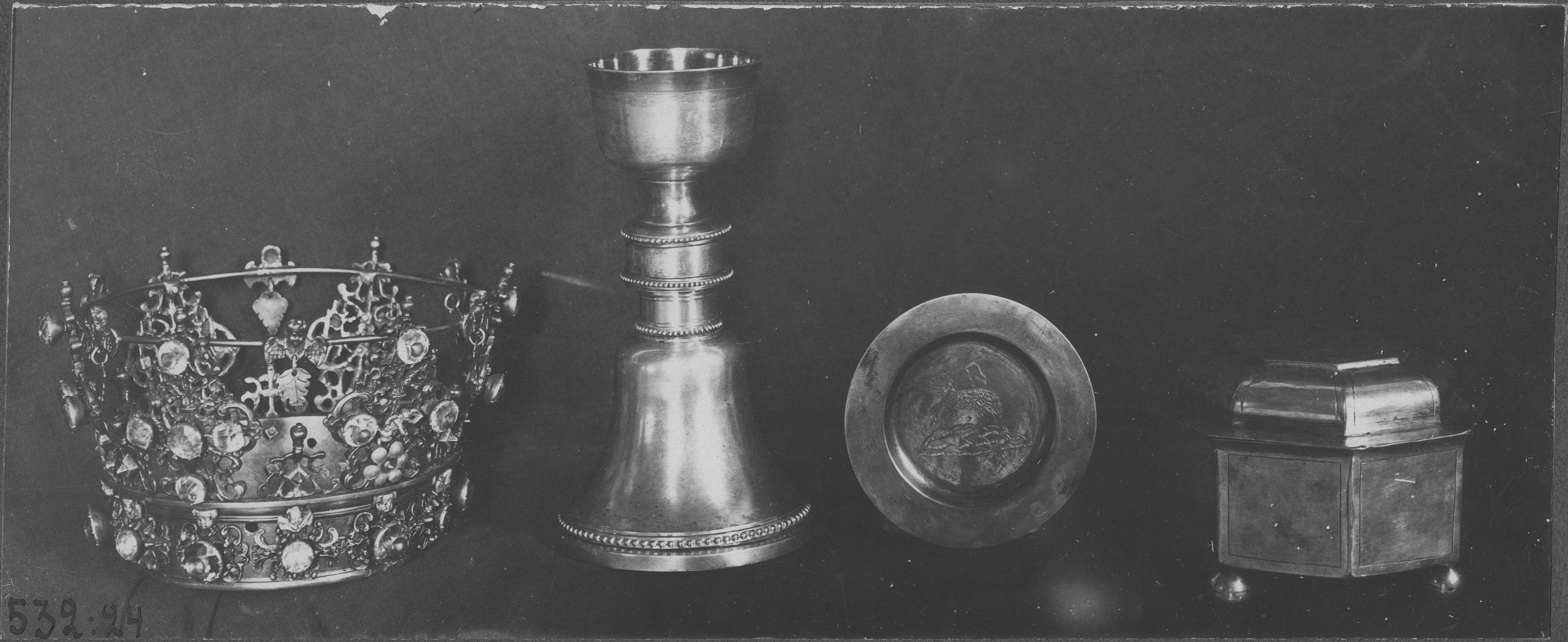 Beskrivning: Brudkrona av Valentin Lennartsson från 1649, samt sockenbudstyg av Lars Hessling från 1789.