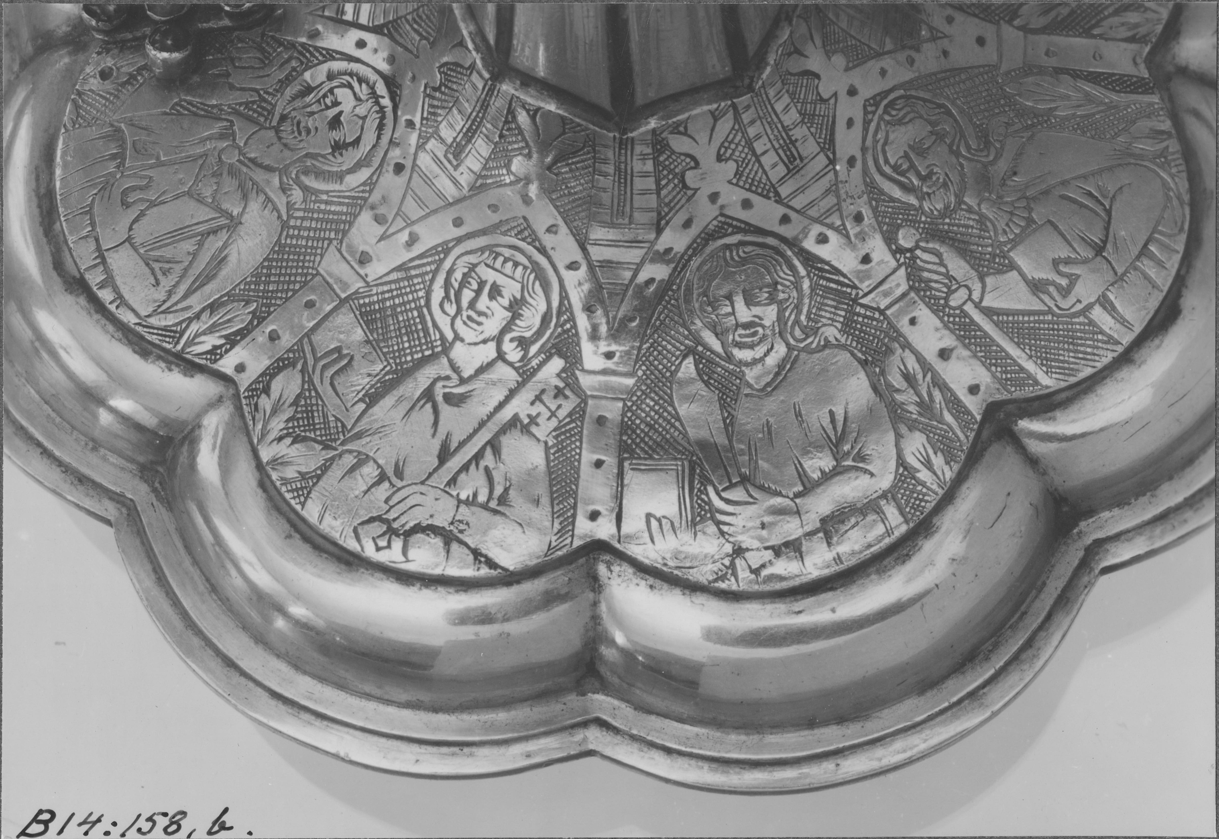 Beskrivning: Kalk av förgyllt silver från 1300-talet - skålen (cuppan) från 1748. Fotpartiet med graverade figurframställningar, Kristus, Maria och några av apostlarna