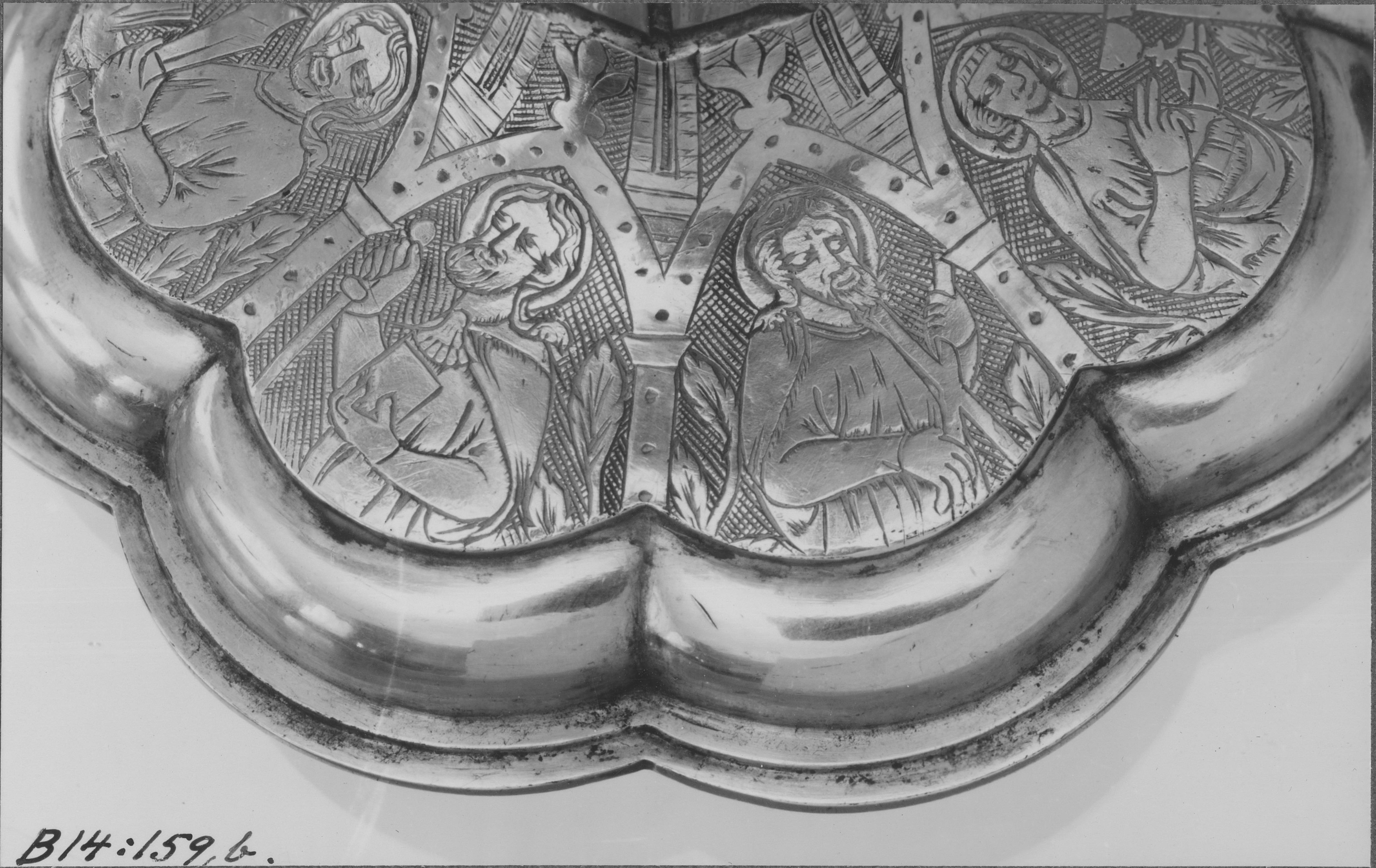 Beskrivning: Kalk av förgyllt silver från 1300-talet - skålen (cuppan) från 1748. Fotpartiet med graverade figurframställningar, Kristus, Maria och några av apostlarna.