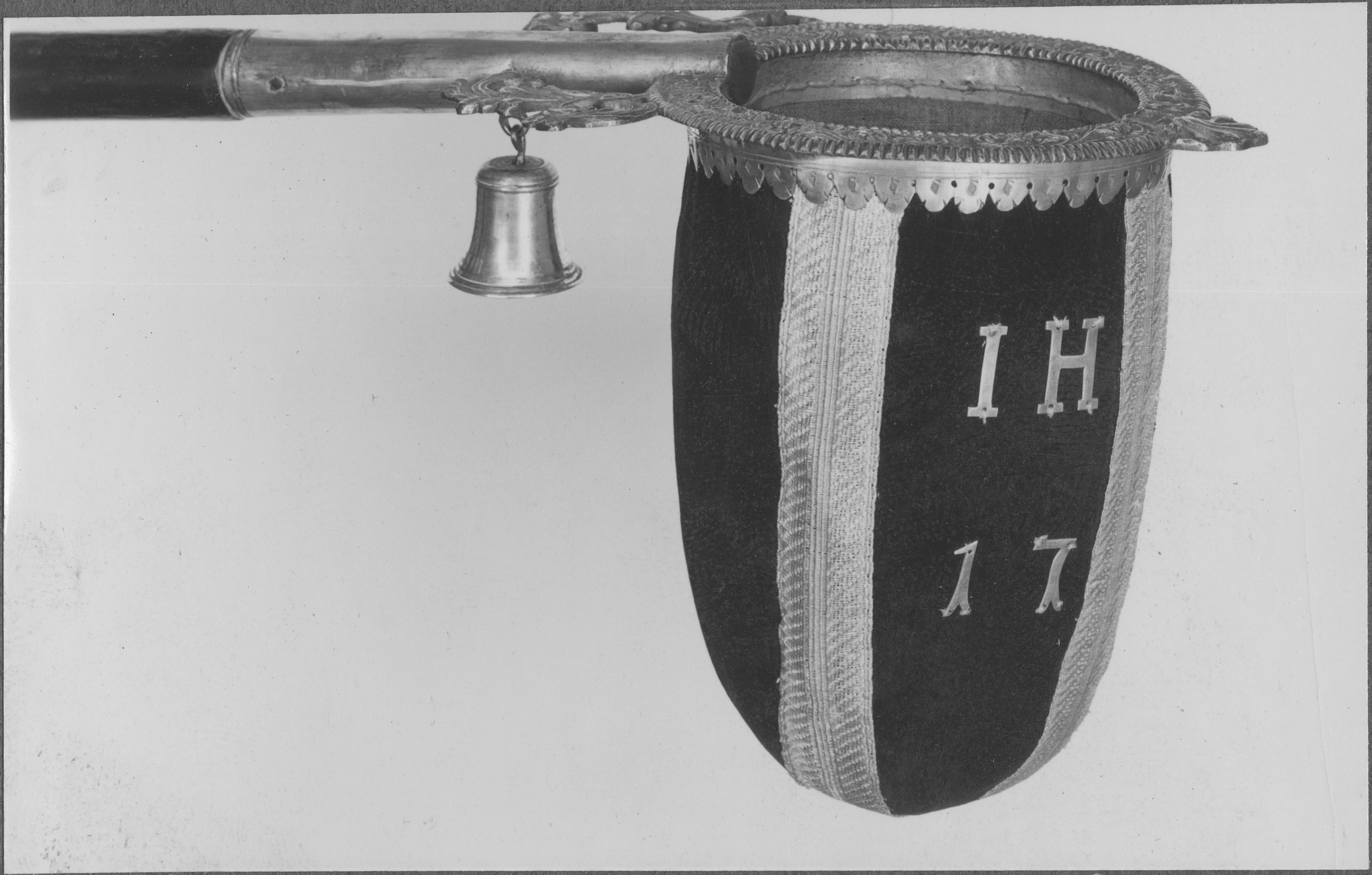 Beskrivning: Kollekthåv av svart sammet med silverband med initialerna IHML 1766. Pietas nr 1914/1939. Foto efter konservering.