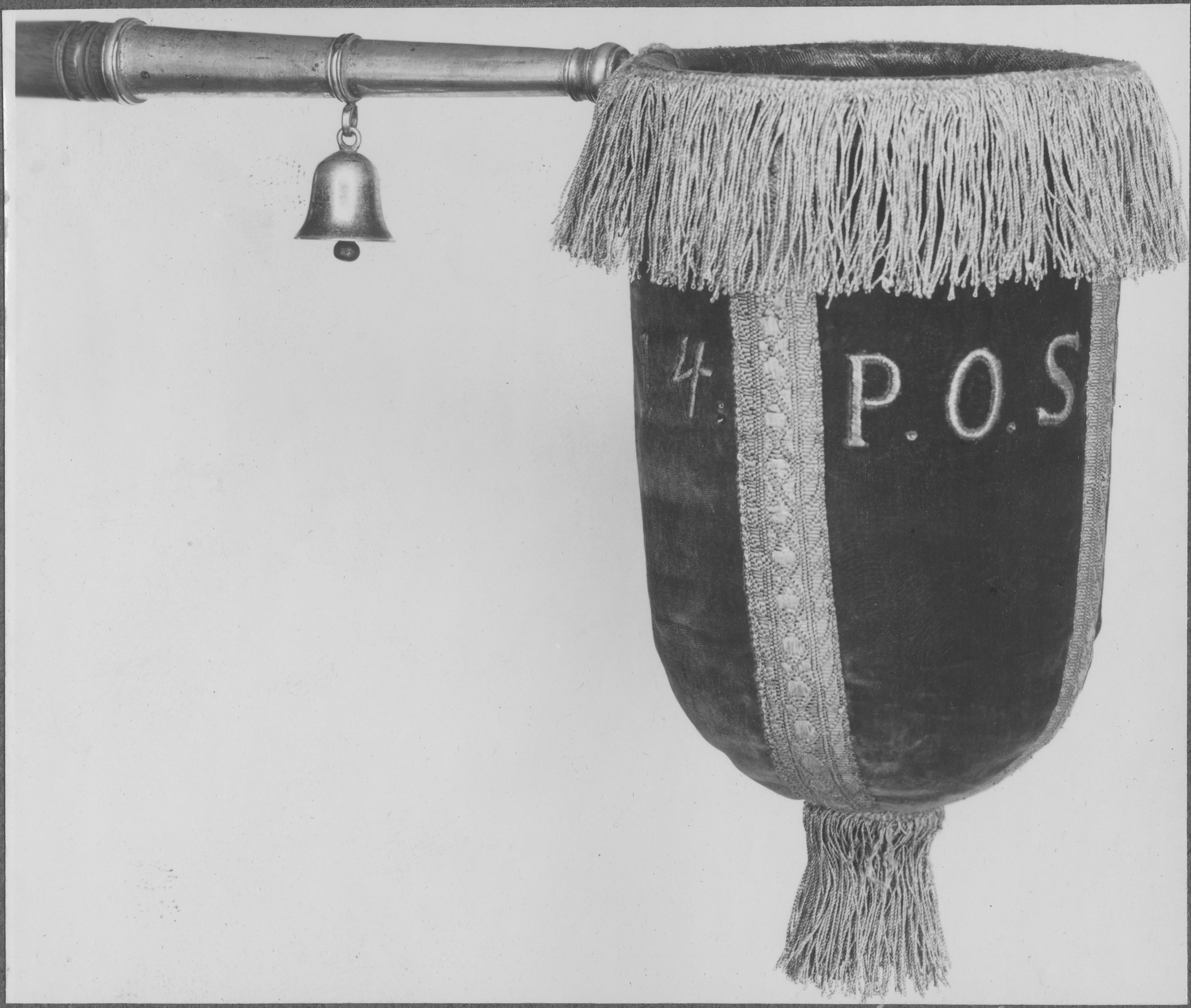 Beskrivning: Kollekthåv av röd sammet med guldband med initialerna P.O.S: L.H.D.: 1814: Pietas nr 1915/1939. Foto efter konservering.