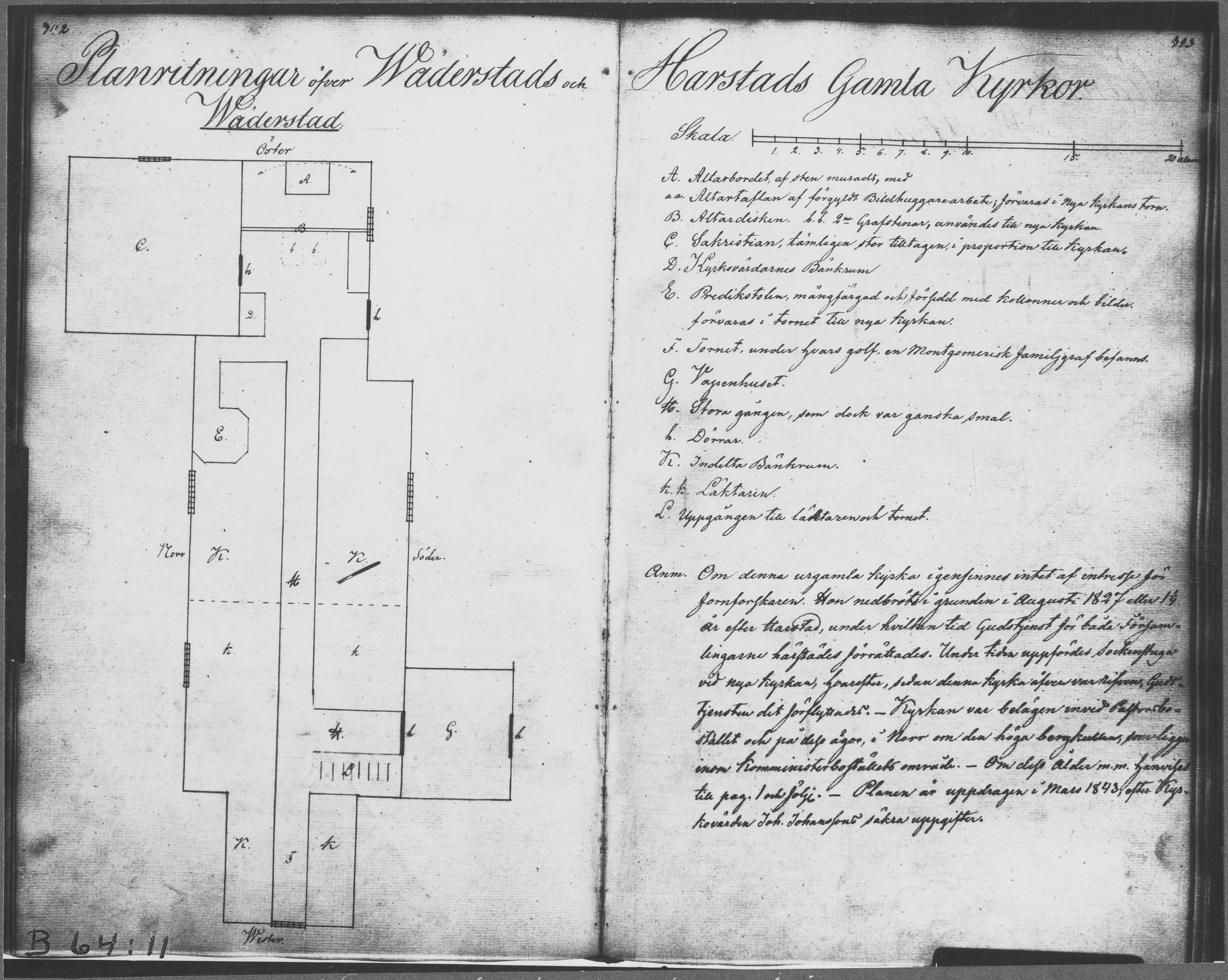 Beskrivning: Ritning i kyrkoarkivet av den gamla kyrkans planlösning, från 1843. Gamla kyrkan revs 1827.