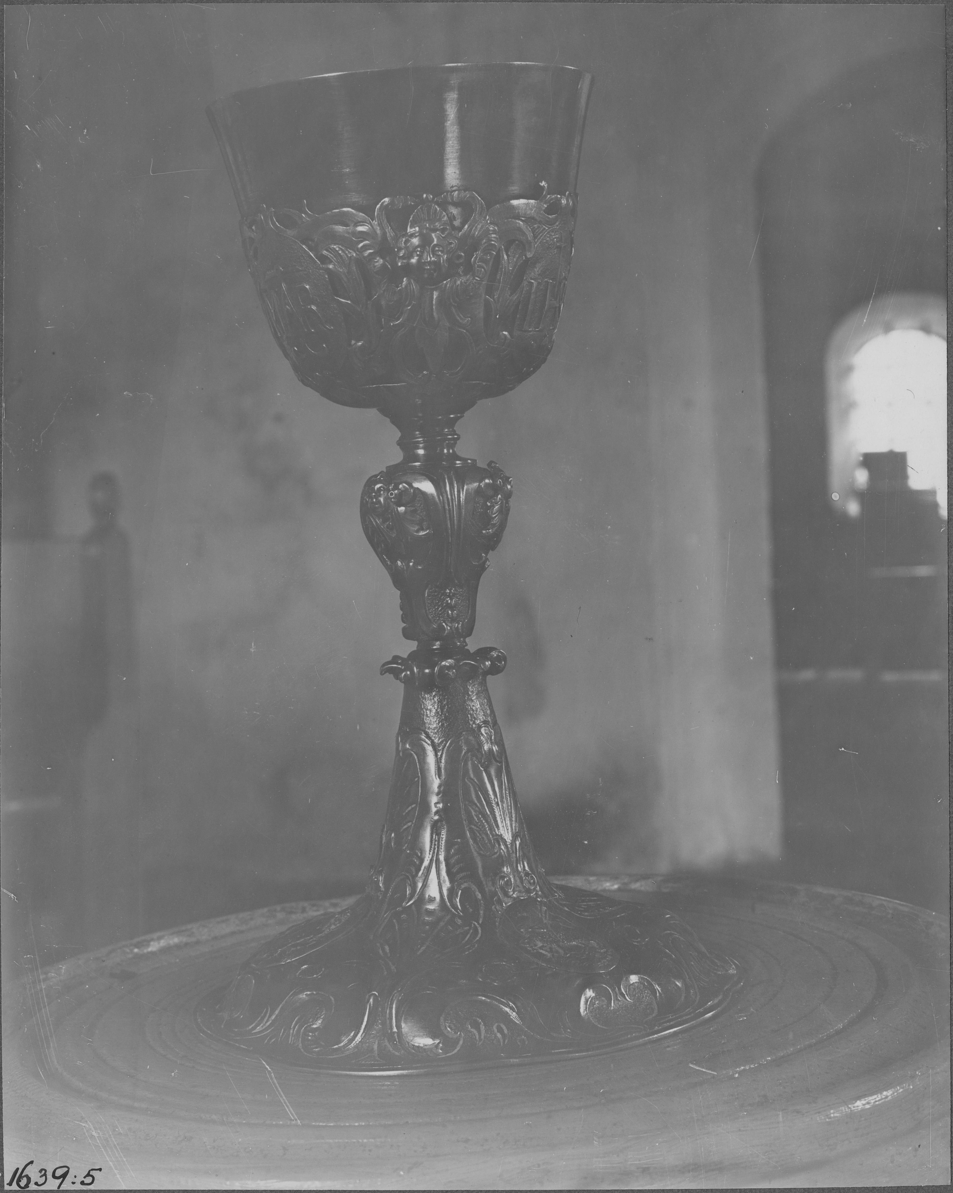 Beskrivning: Nattvardskalk av silver, tyskt arbete från 1600-talets förra hälft. Foto från snabbinventeringen.