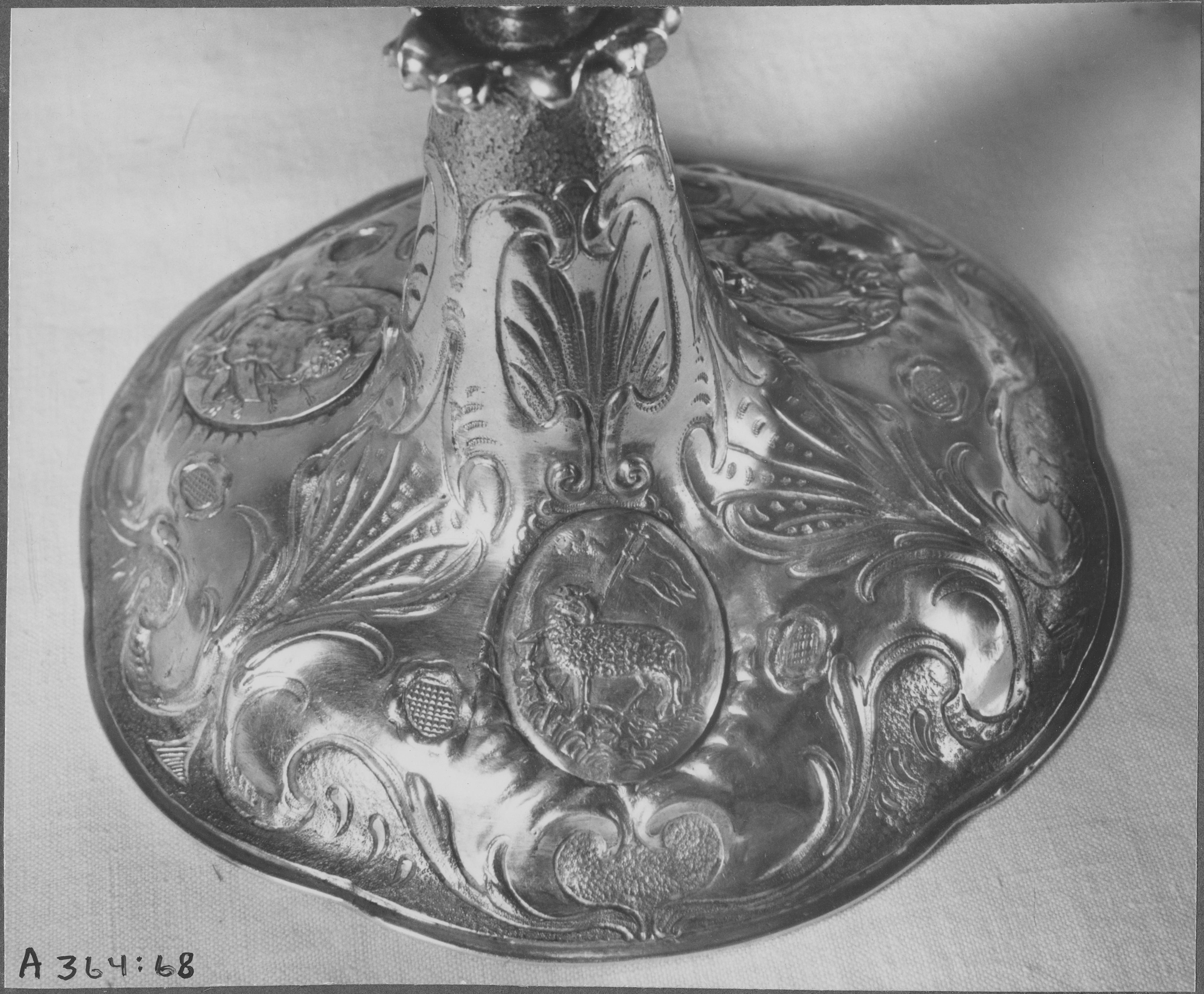 Beskrivning: Nattvardskalk av silver, tyskt arbete från 1600-talets förra hälft. Detalj av fot.