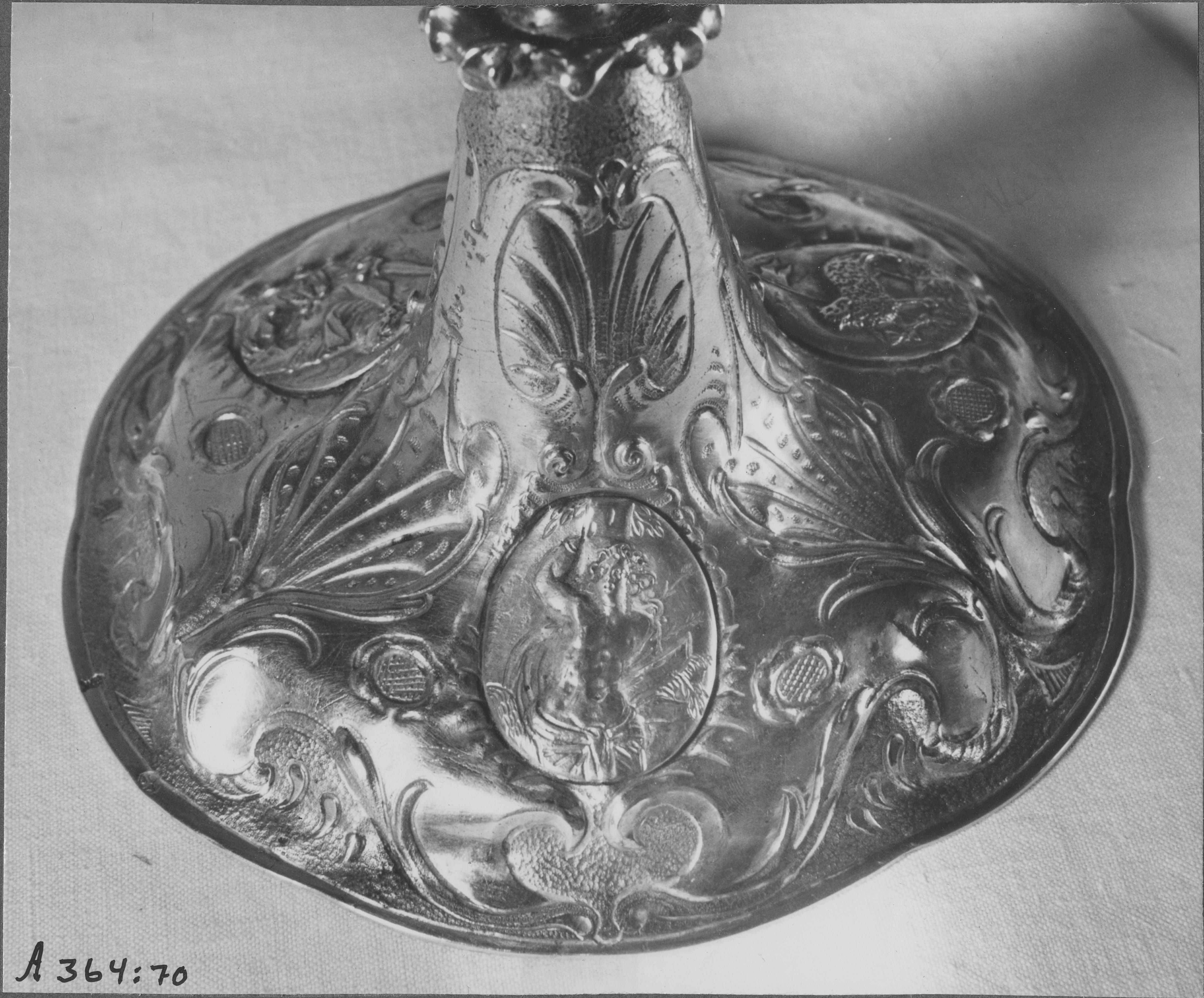 Beskrivning: Nattvardskalk av silver, tyskt arbete från 1600-talets förra hälft. Detalj av fot.