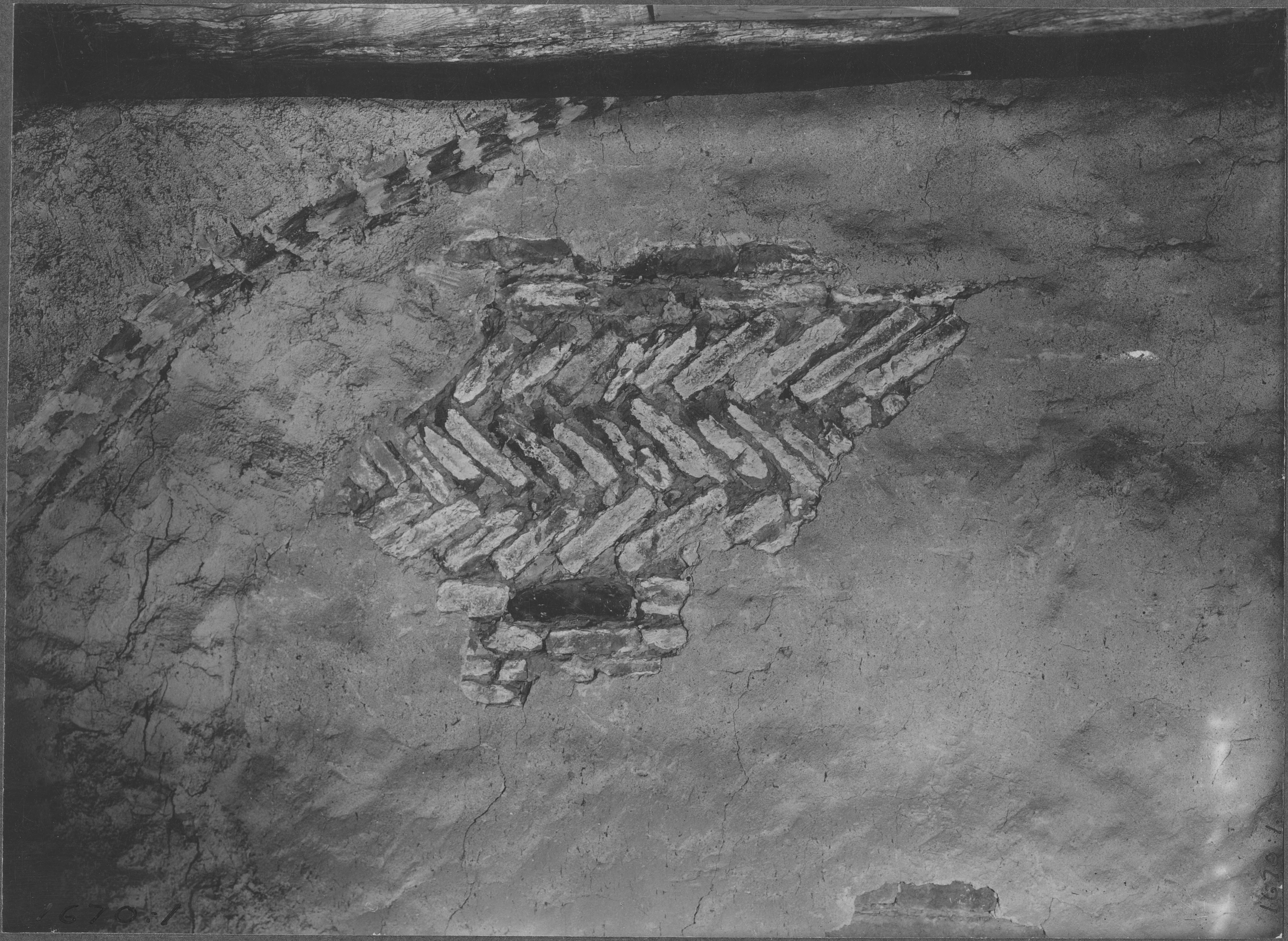 Beskrivning: Medeltida murningsteknik med ett fiskbensliknande mönster, sk opus spicatum i tornets första våning på kyrkans västgavel.