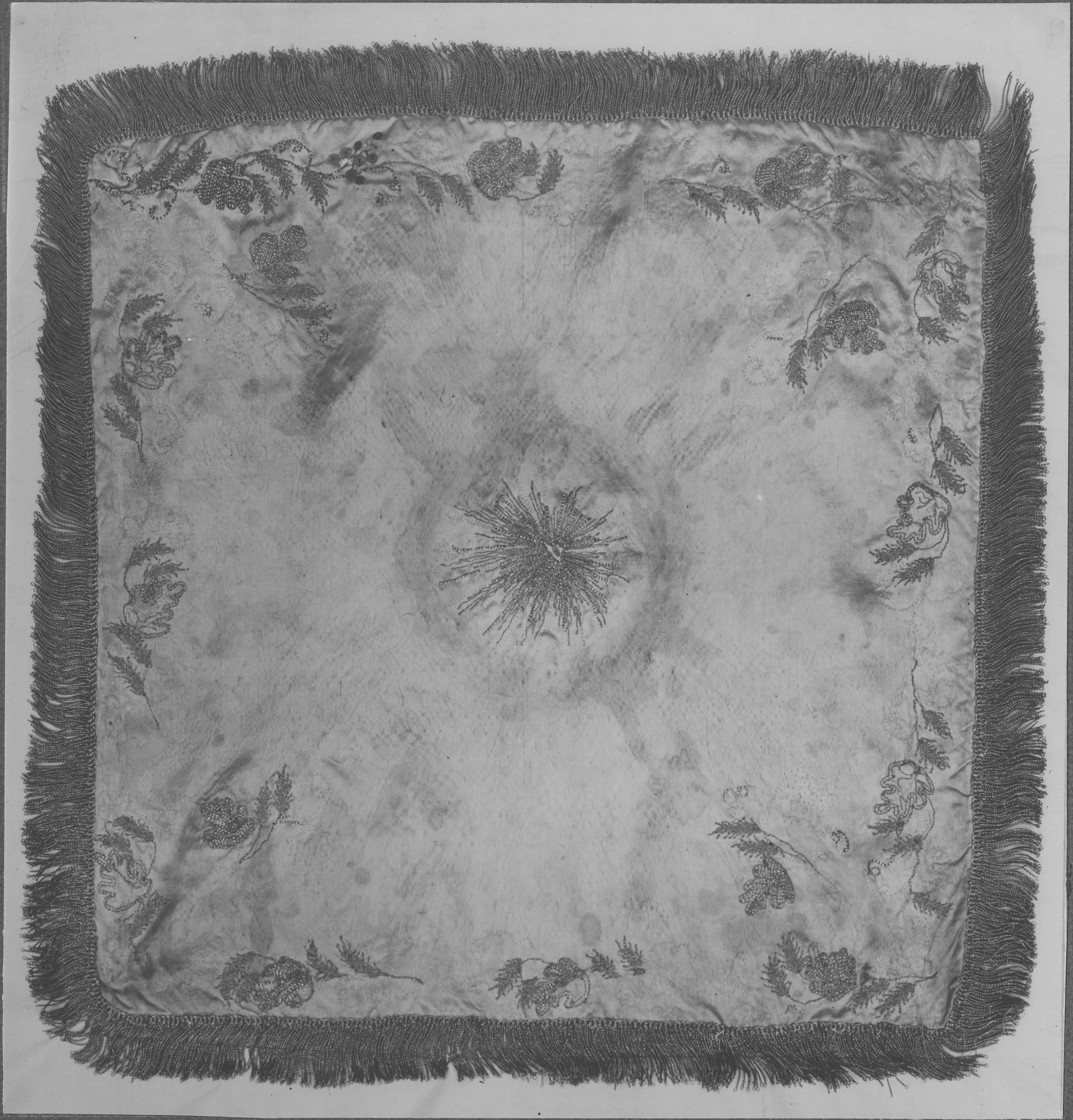 Beskrivning: Kalkkläde från ca 1800 av vitt atlassiden med guldbroderier. Foto efter konservering. Pietasnummer 1209/1929.