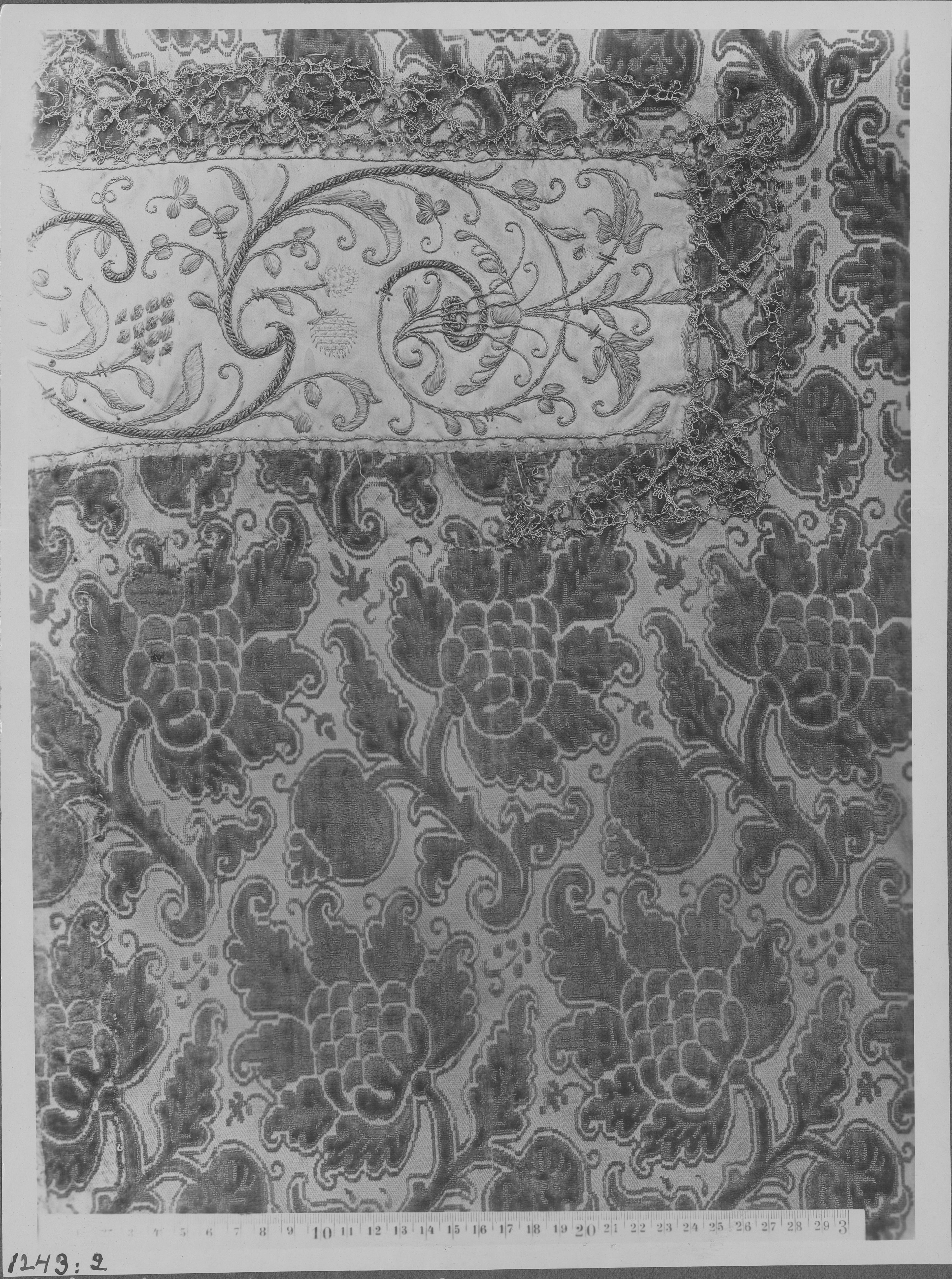 Beskrivning: Detalj av mässhake av rödvit sammet från Italien, 1600-talet, nu i Östergötlands museum. Avbildad vid textilutställningen i Stockholm 1929, nr 264.