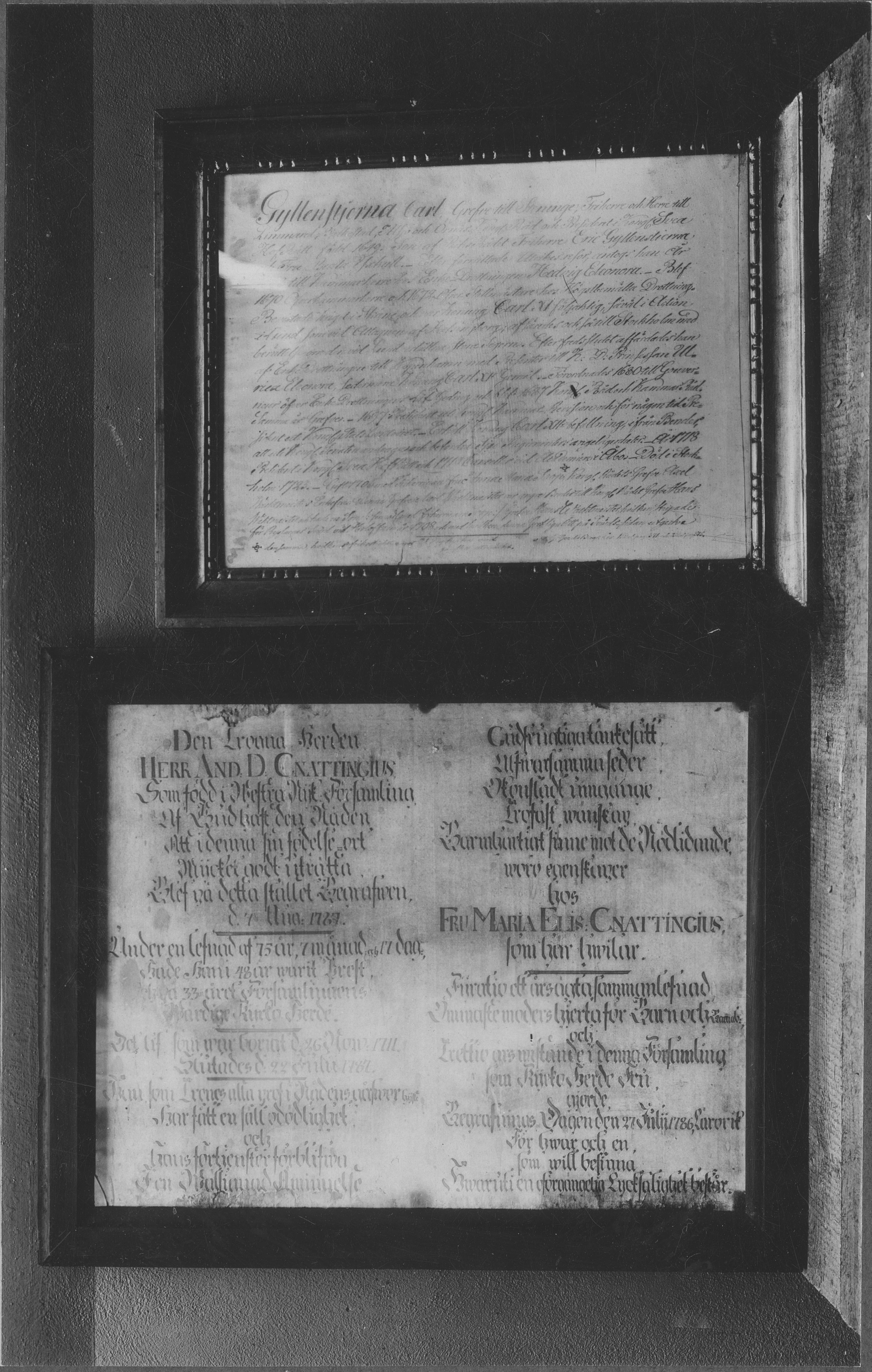 Beskrivning: Tavlor med text över Gyllenstierna och Cnattingius. Foto efter restaurering 1929.