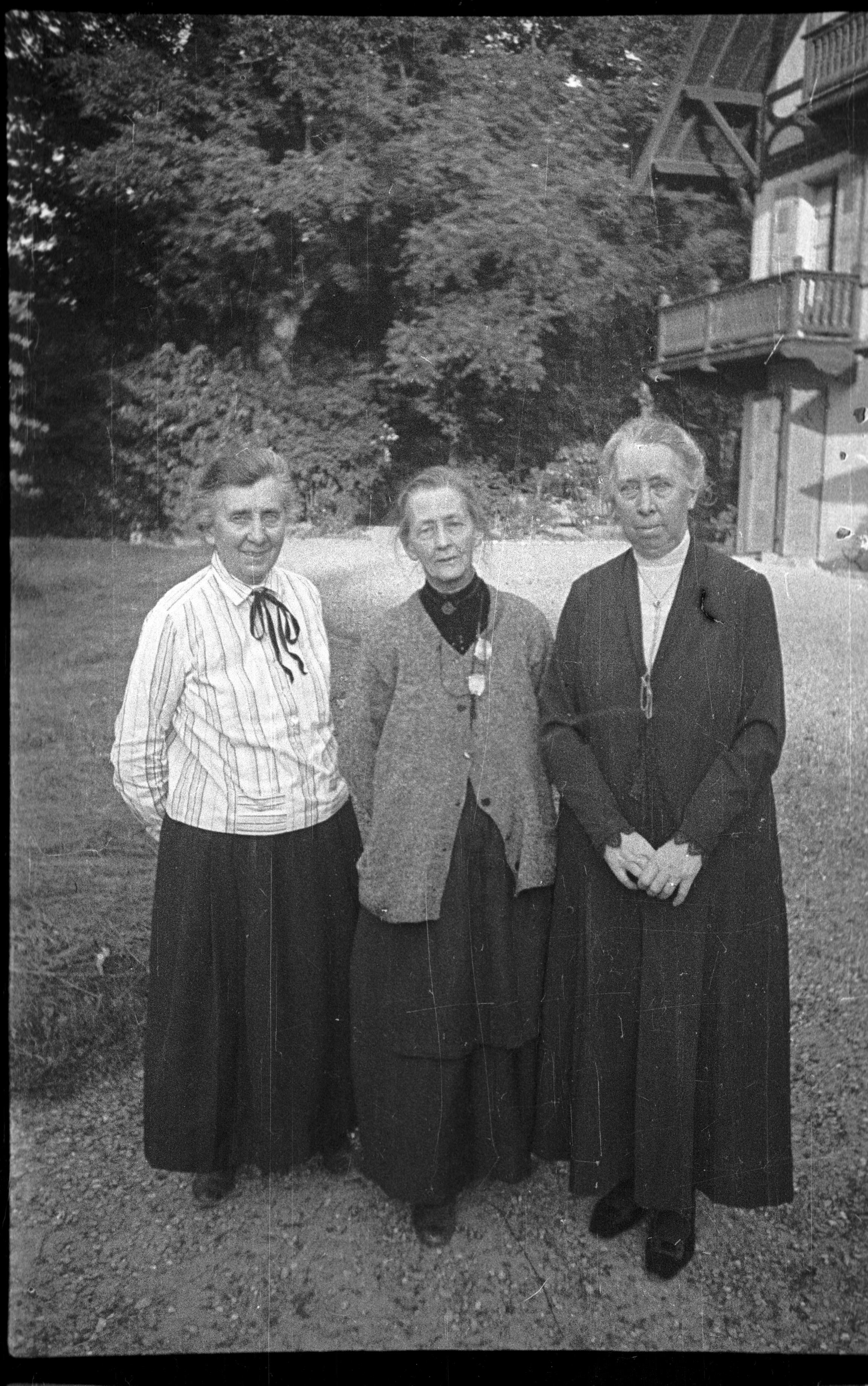 Beskrivning: "Grange-Colomb, från vänster Mlle Neydeck, Mme Coulomb och Mme Penard"