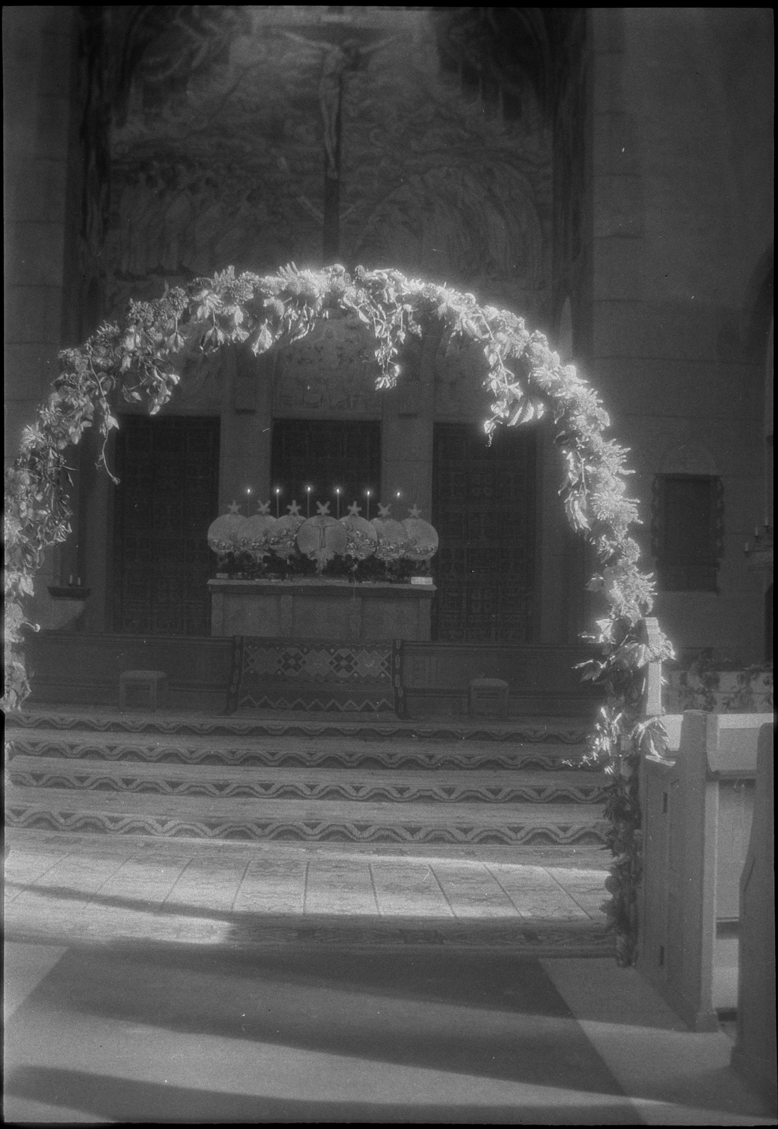 Beskrivning: Brudbågen och altaret. Fotografi taget vid Marianne Blix och Carol Wallenbergs bröllop