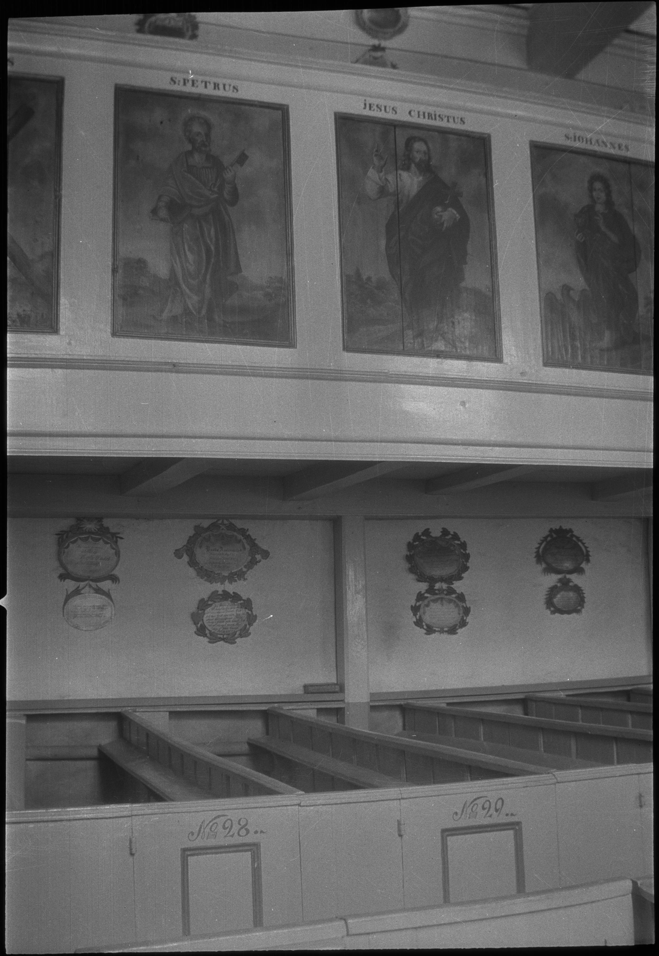 Berit Wallenbergs anteckningar:Partille kyrkas inre, detalj av läktarbröstningen och kistplåtar