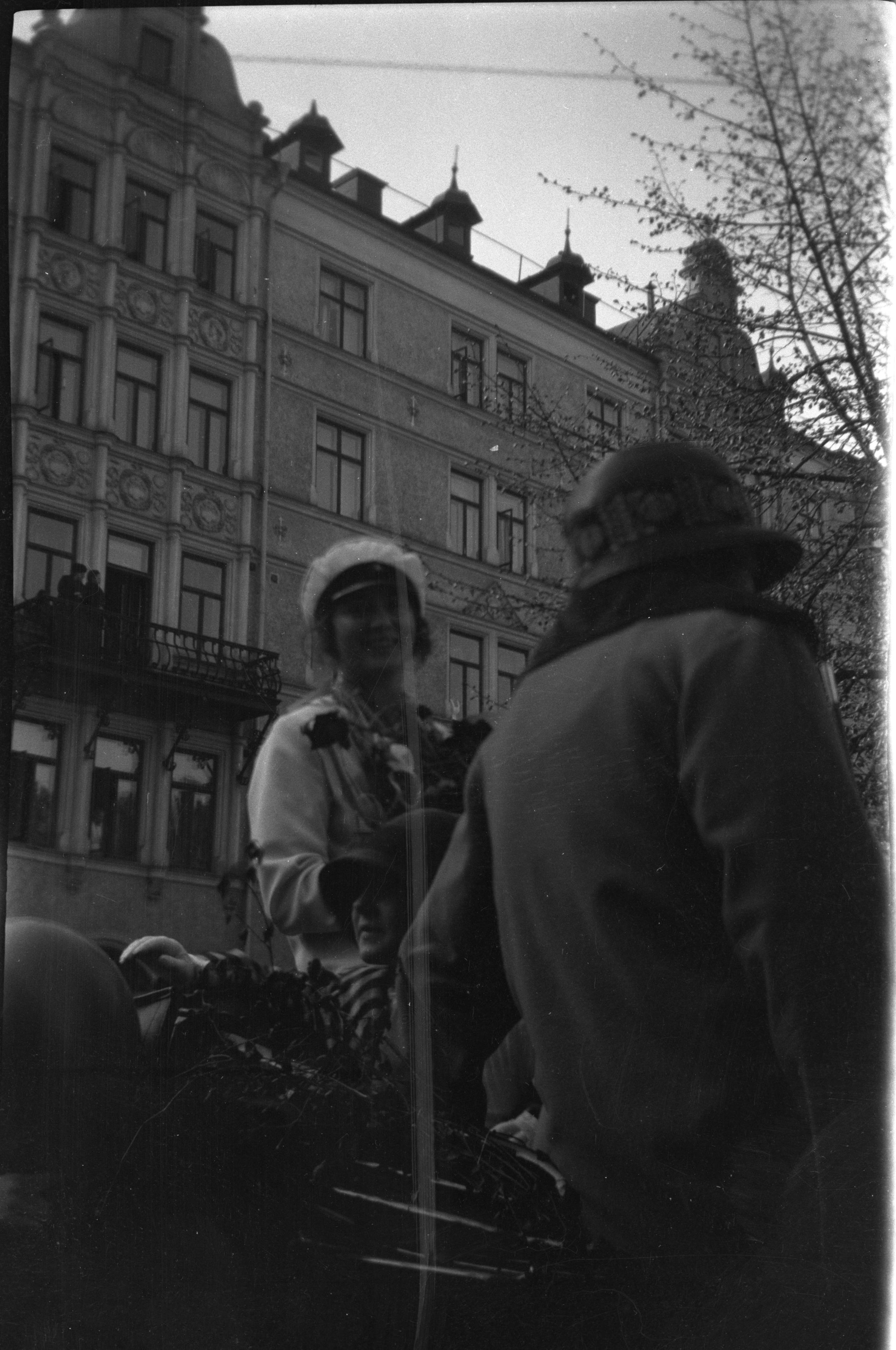Beskrivning: Brita Curman sedd framifrån sittande i blomstersmyckad vagn omgiven av studenter