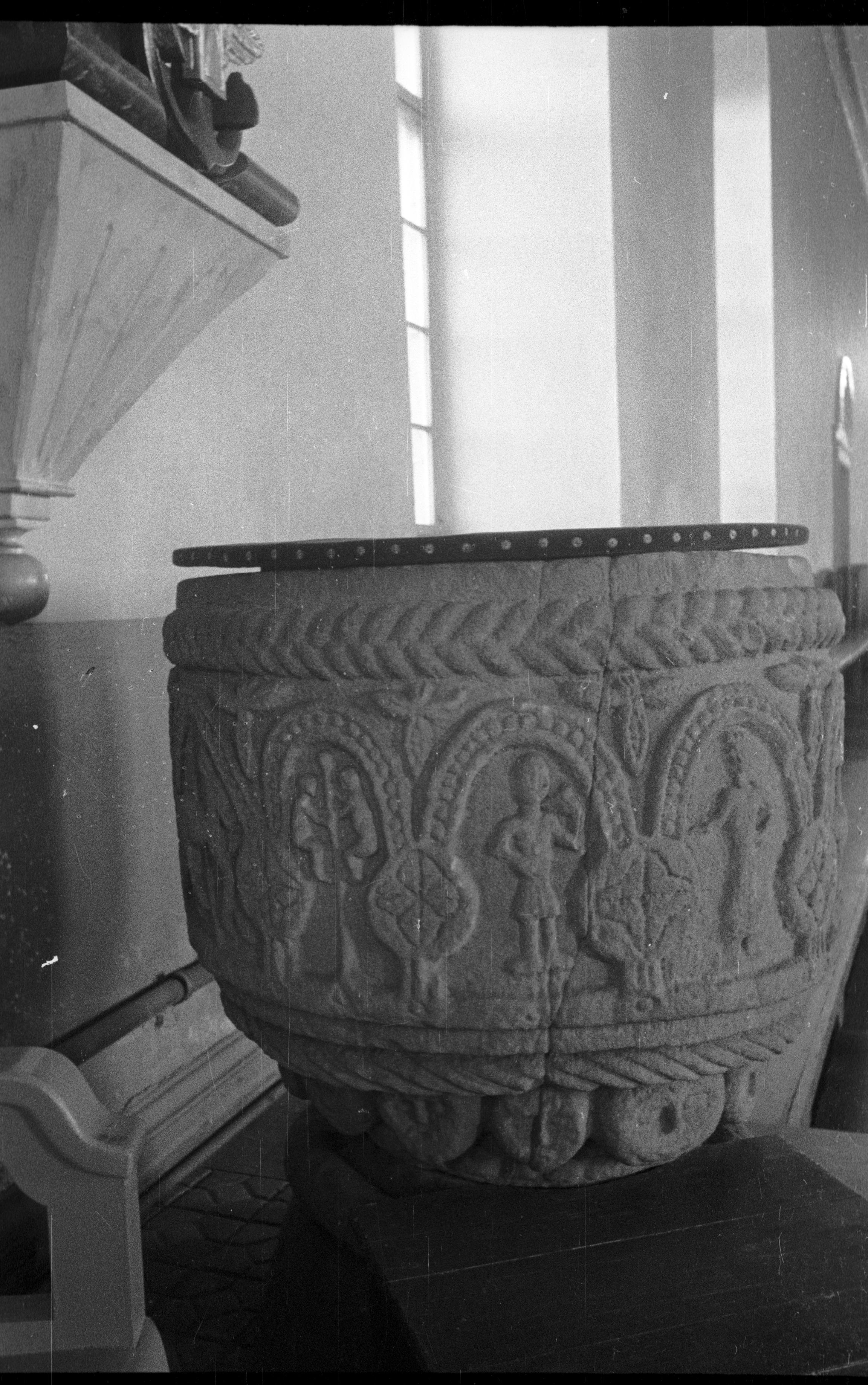 Beskrivning: Dopfunt, sandsten, Bestiarius skola, början av 1200-talet