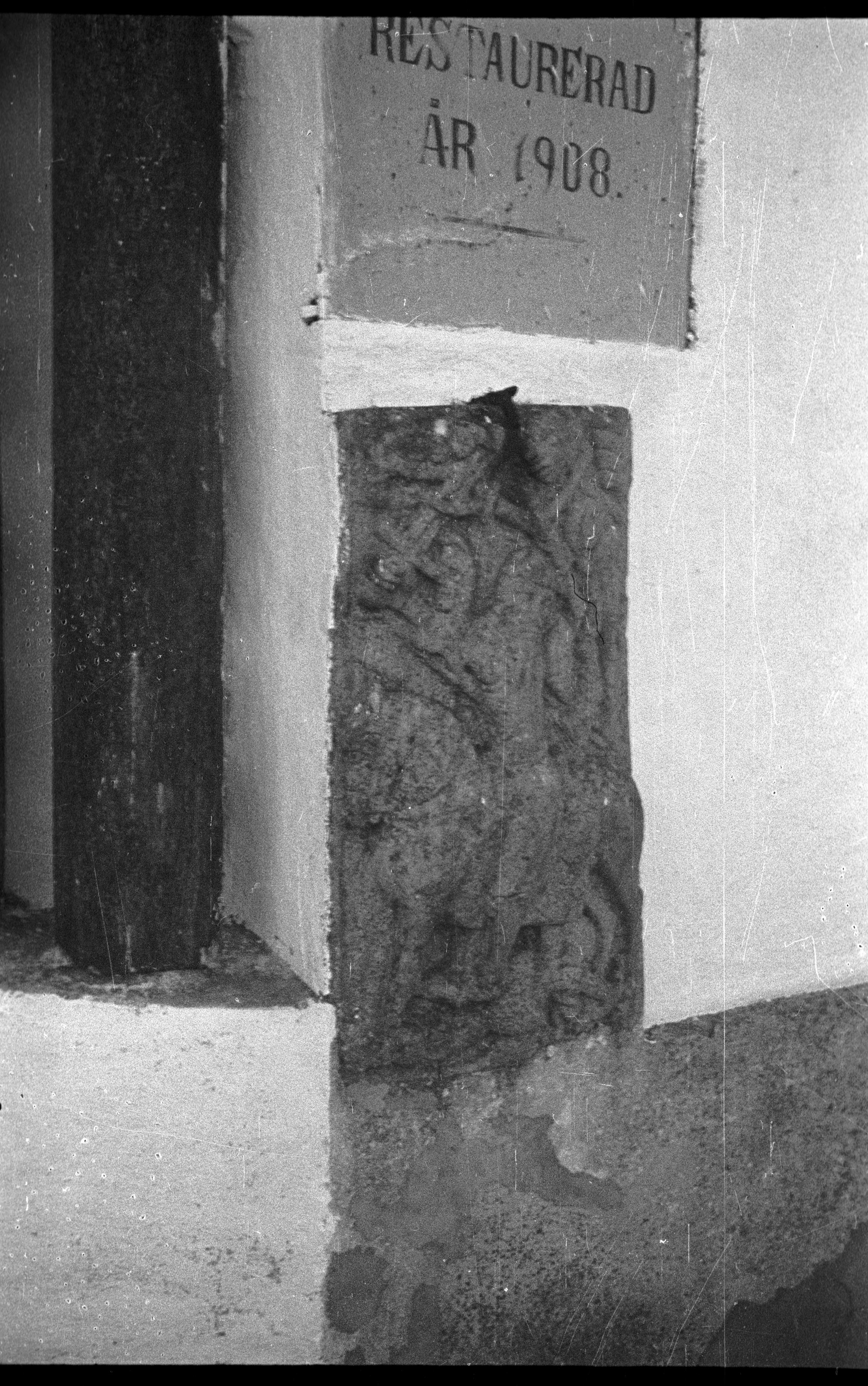 Beskrivning: Stenrelief på östra sidan om vapenhusets portal