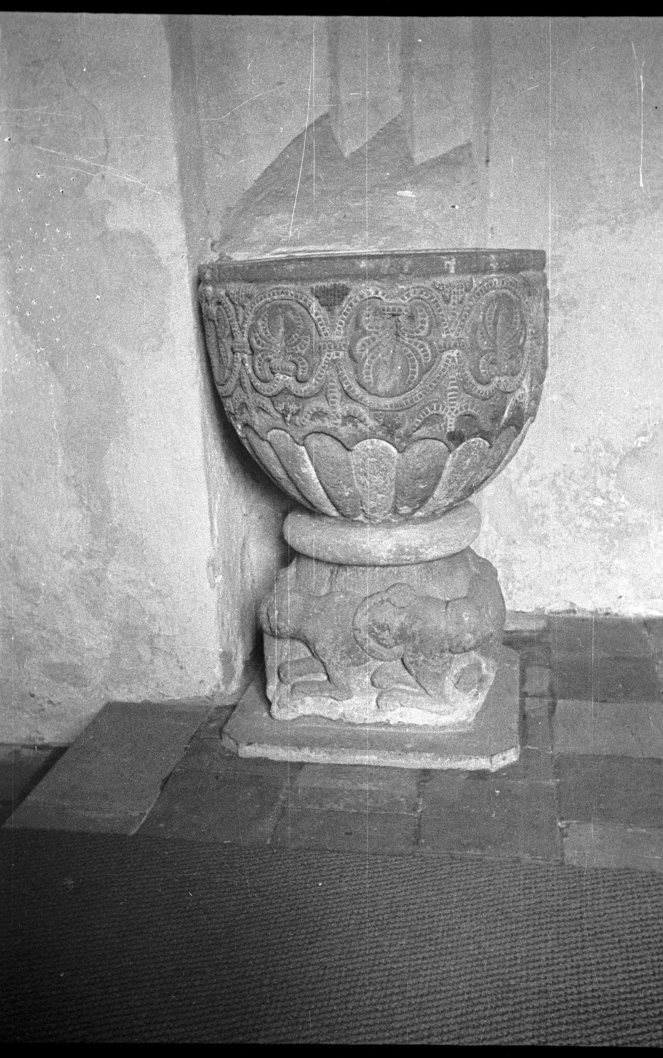 Beskrivning: Dopfunt av sandsten. Målad i gul, röd och blå oljefärg.