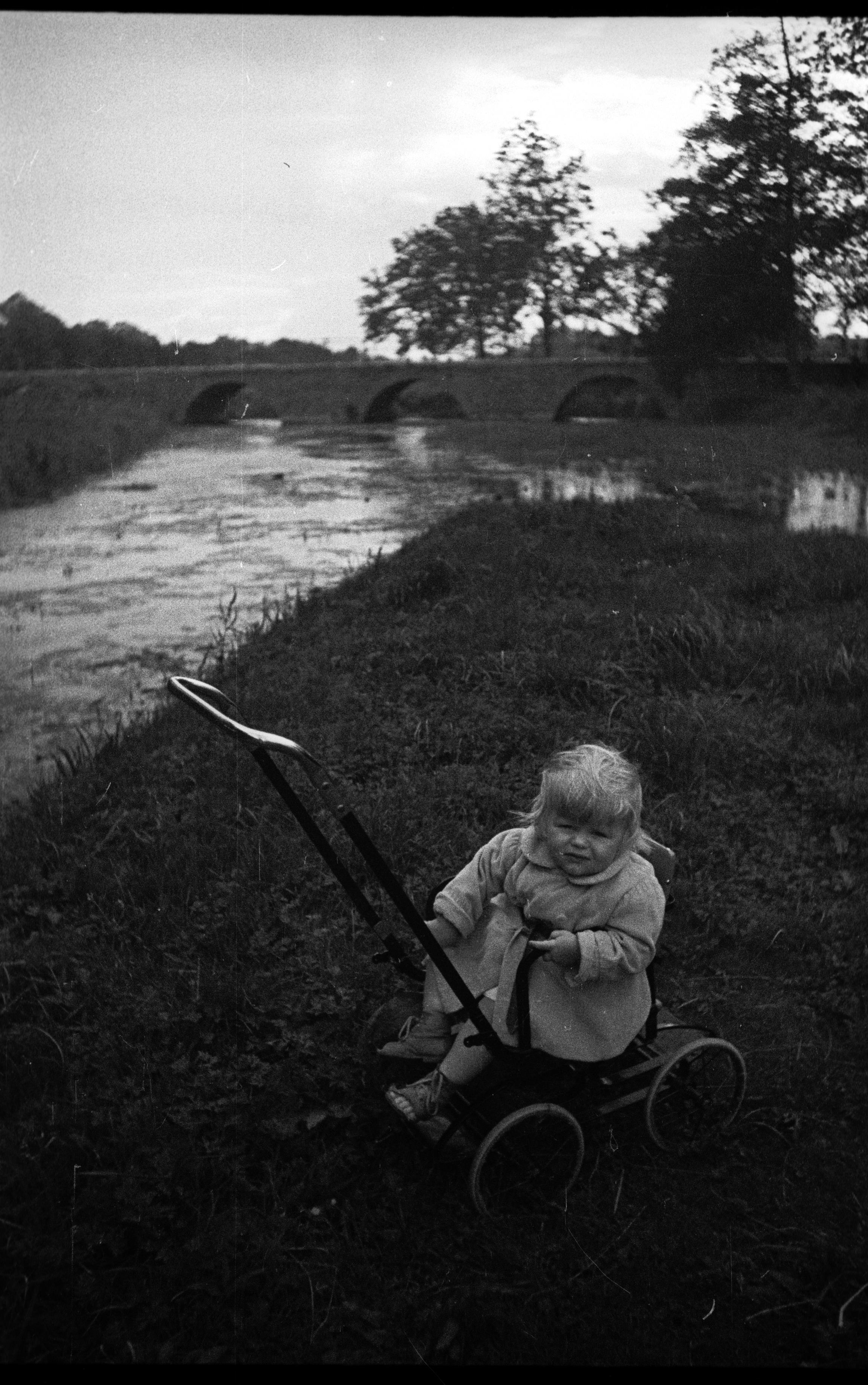 Beskrivning: Catharina Wallenberg i barnvagn, bro i bakgrunden