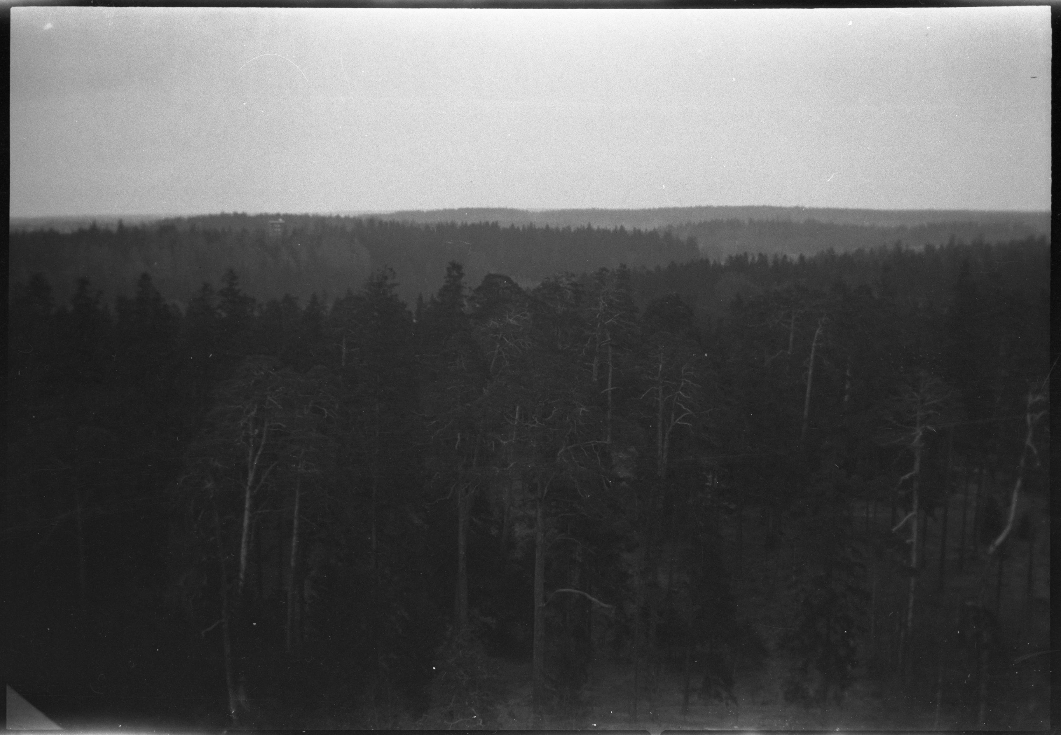 Beskrivning: Utsikt från Stiftelsen Rödakorshemmets tak över omkringliggande skog