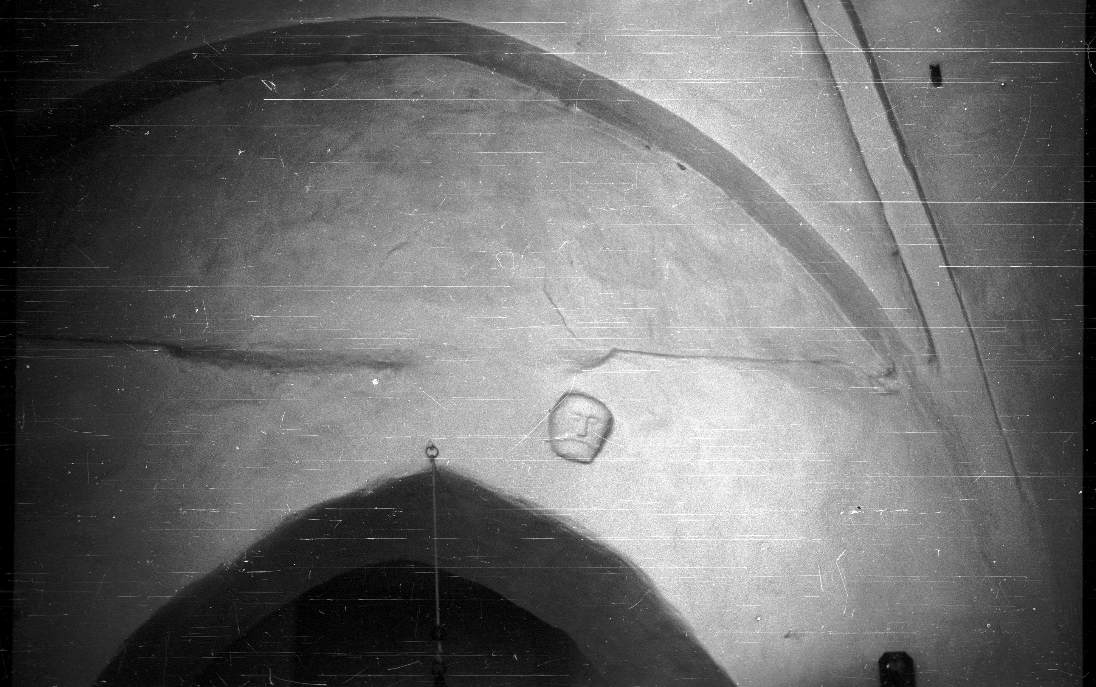 Beskrivning: Skulpterat manshuvud ovanför tornbågen