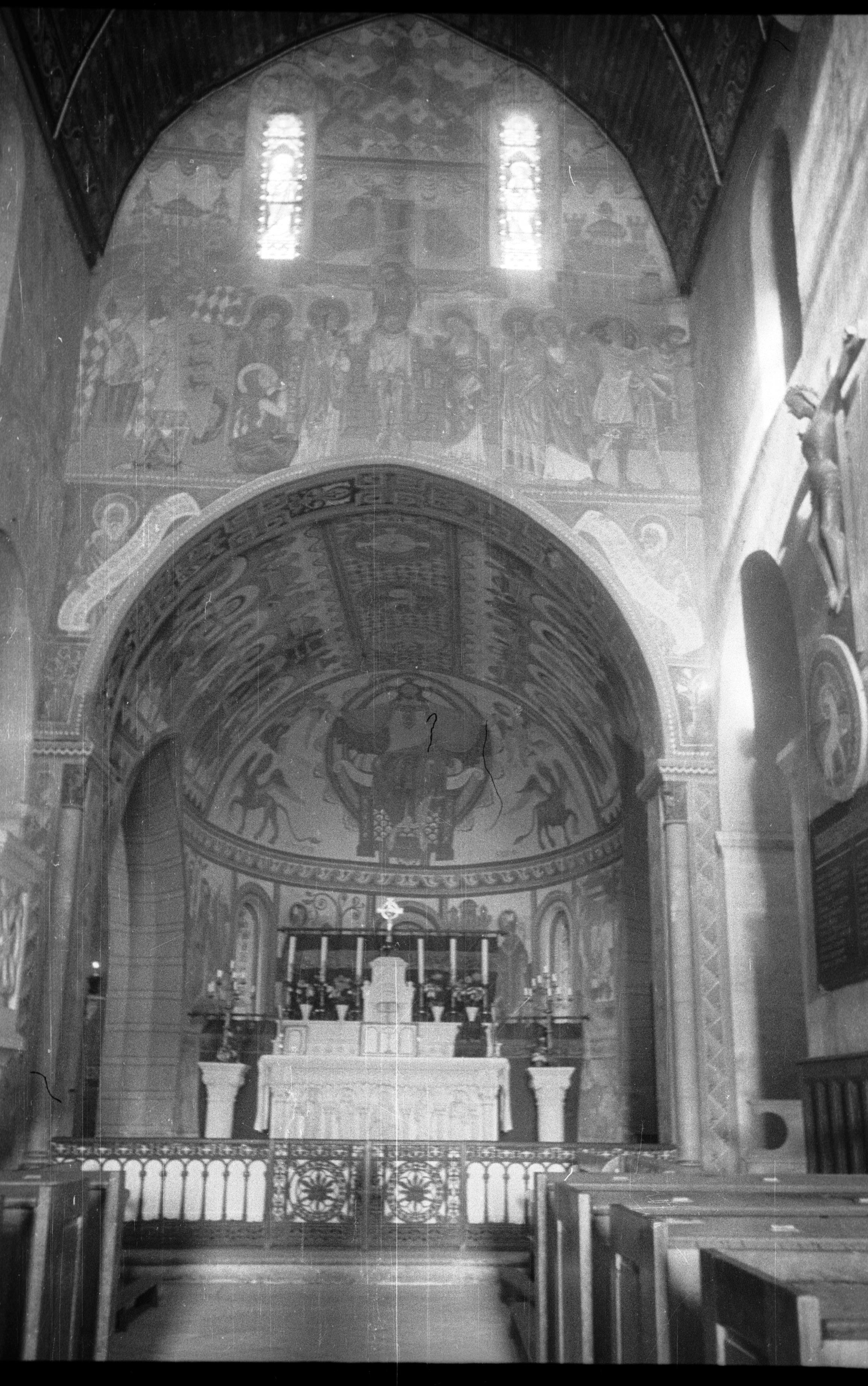 Beskrivning: Poncé sur le Loir. Interiör mot koret med fresker.