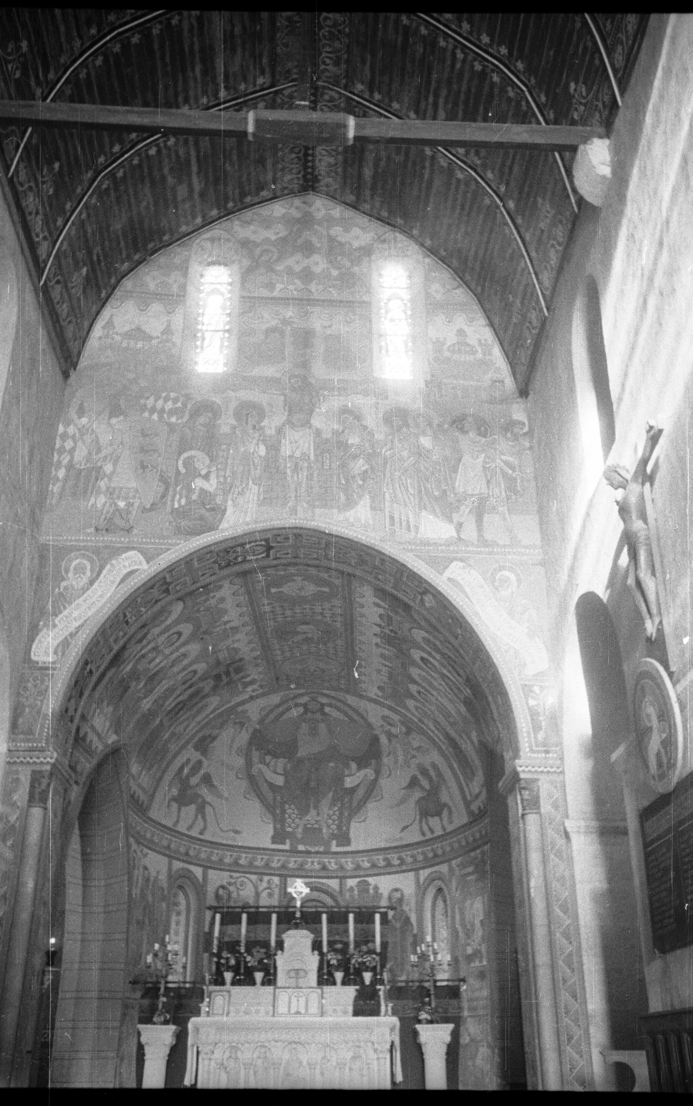 Beskrivning: Beskrivning: Poncé sur le Loir. Interiör mot koret med fresker. Fotosyfte: