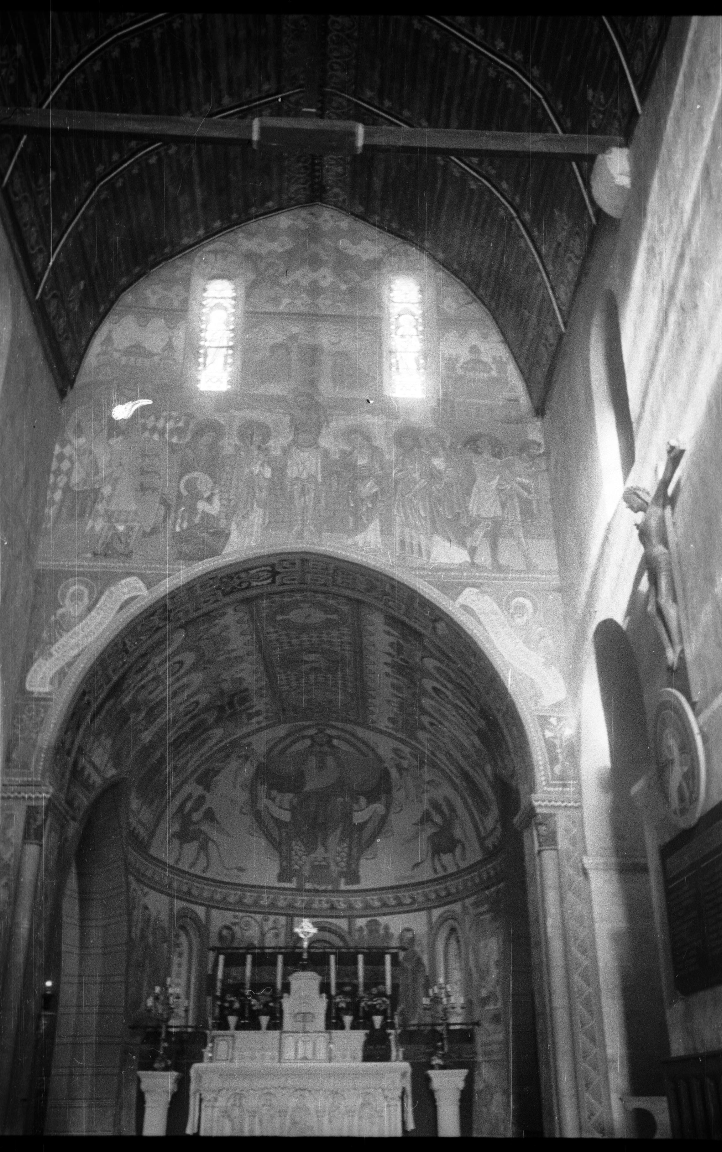 Beskrivning: Poncé sur le Loir. Interiör mot koret med fresker.