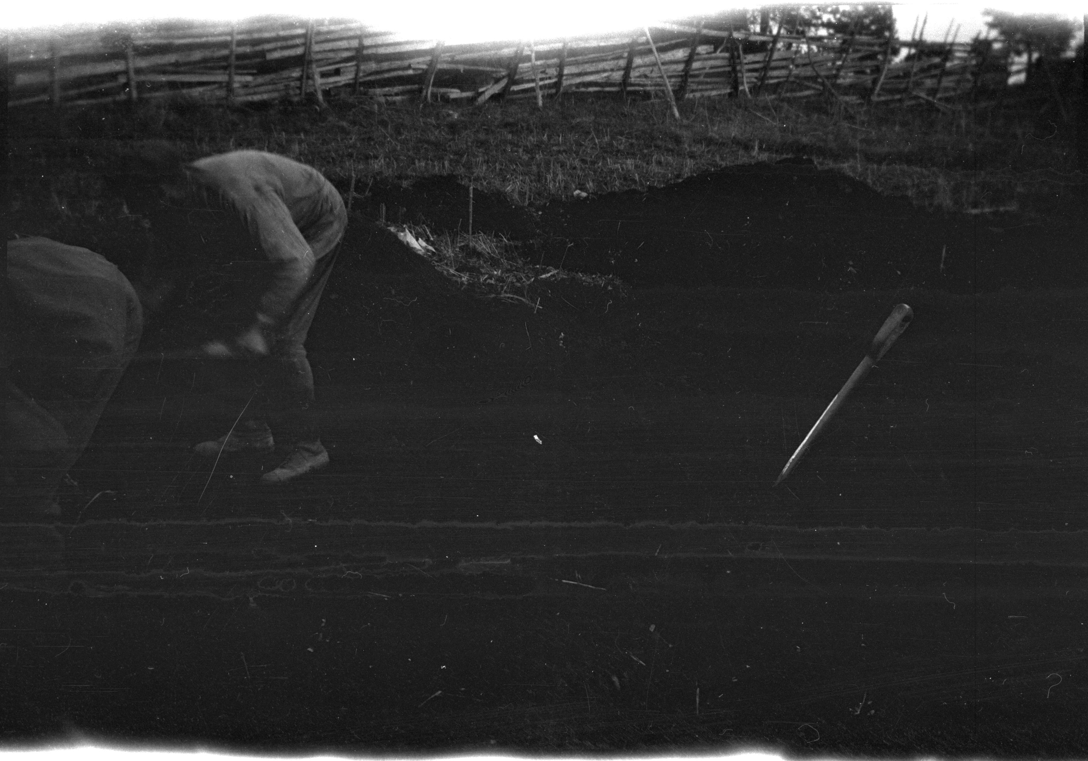 Beskrivning: Arkeologer i arbete. "Bronsåldershusgrunder utgrävas."