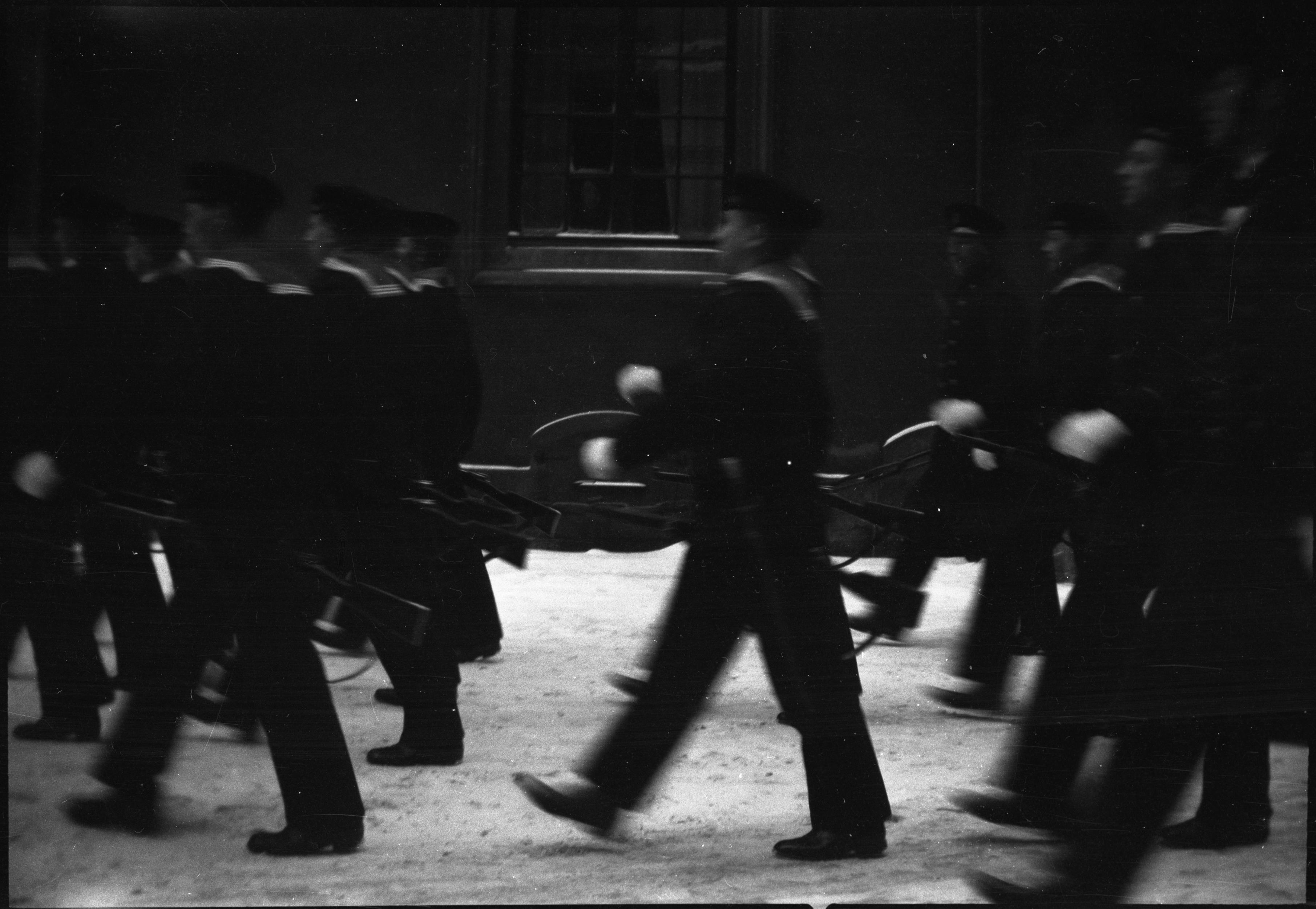 Beskrivning: "Flottan på vaktparad i sträng köld"