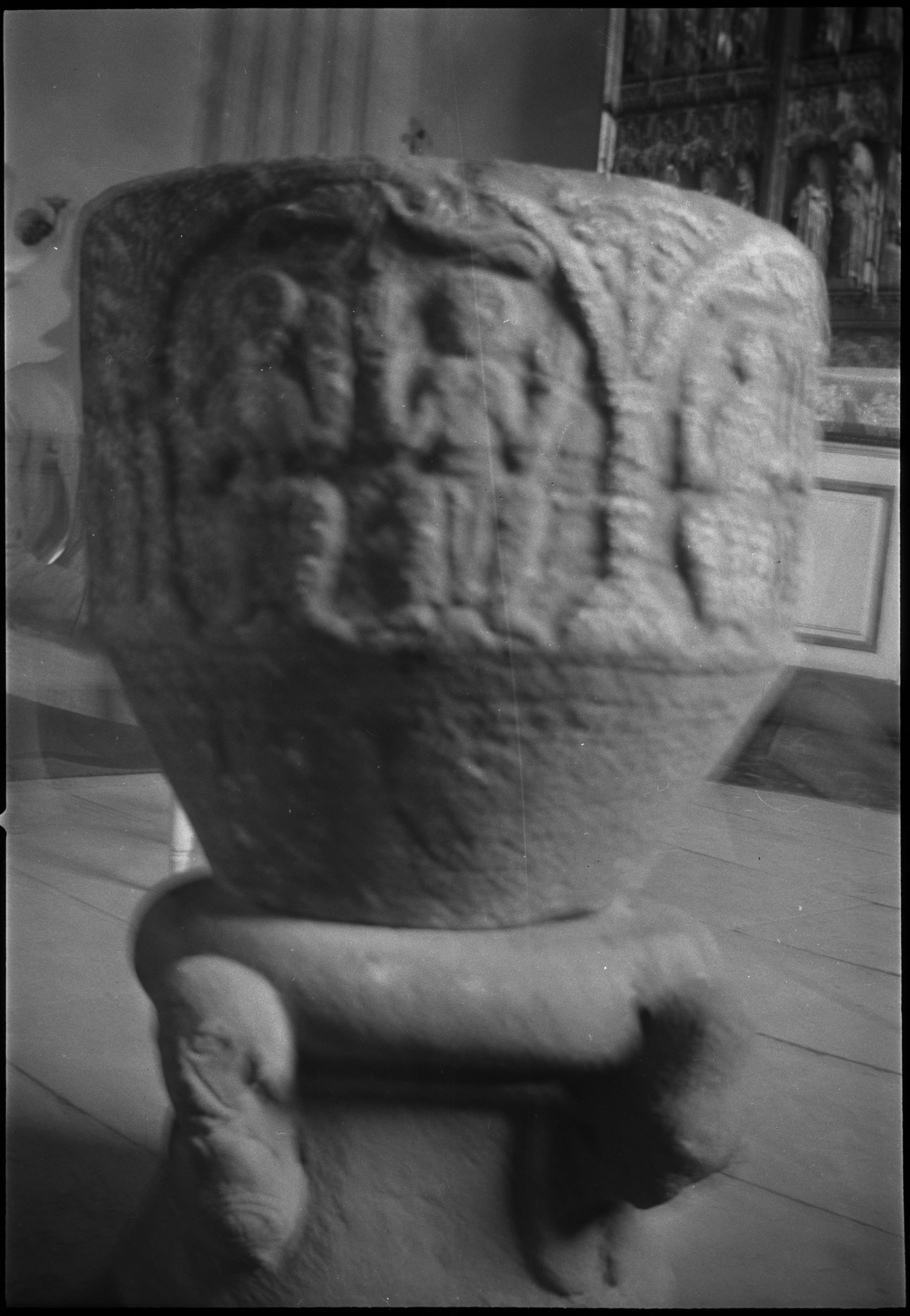 Beskrivning: Dopfunt av sandsten, 1100-talet