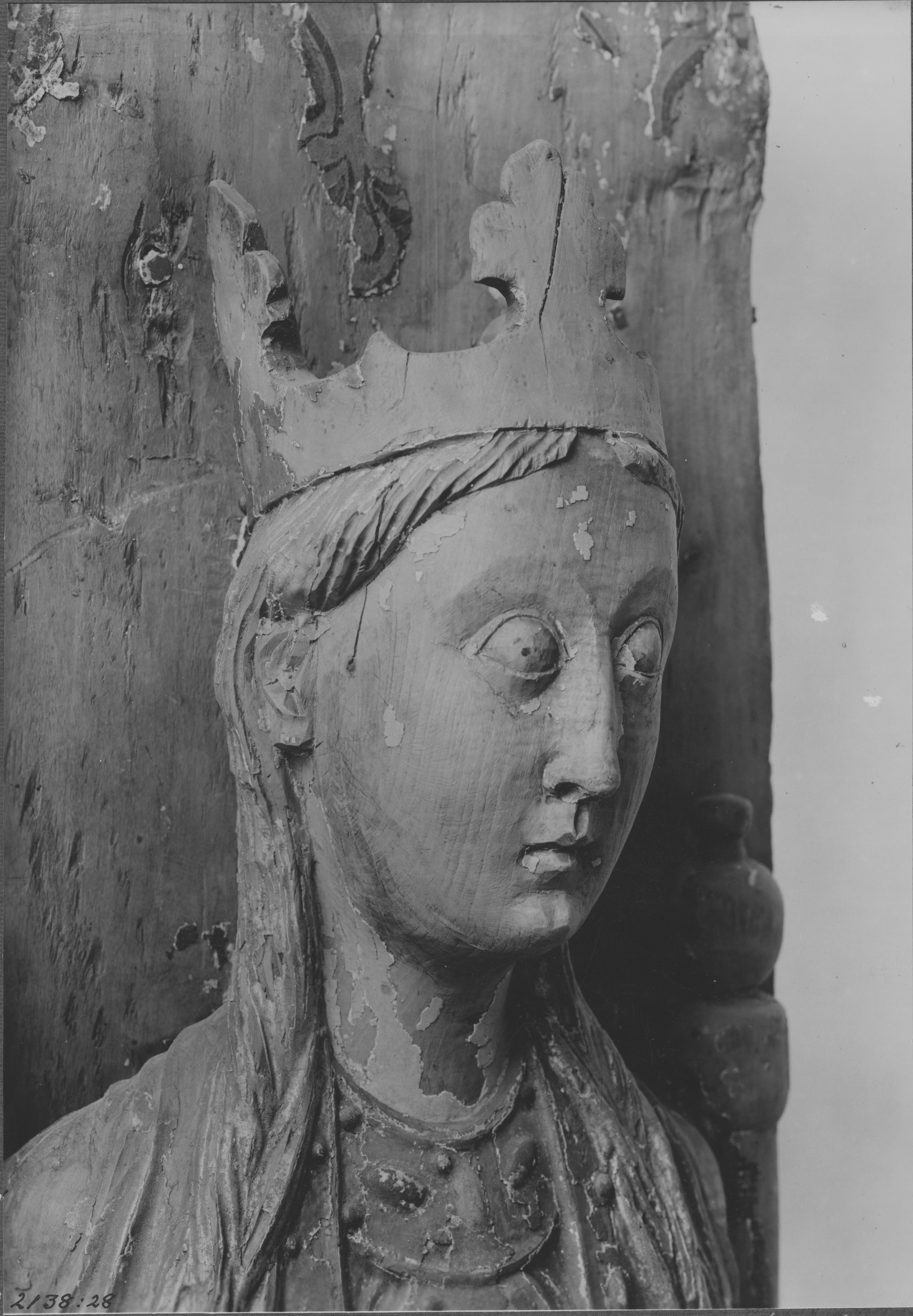 Beskrivning: Träskulptur föreställande Madonnan och barnet, detalj.