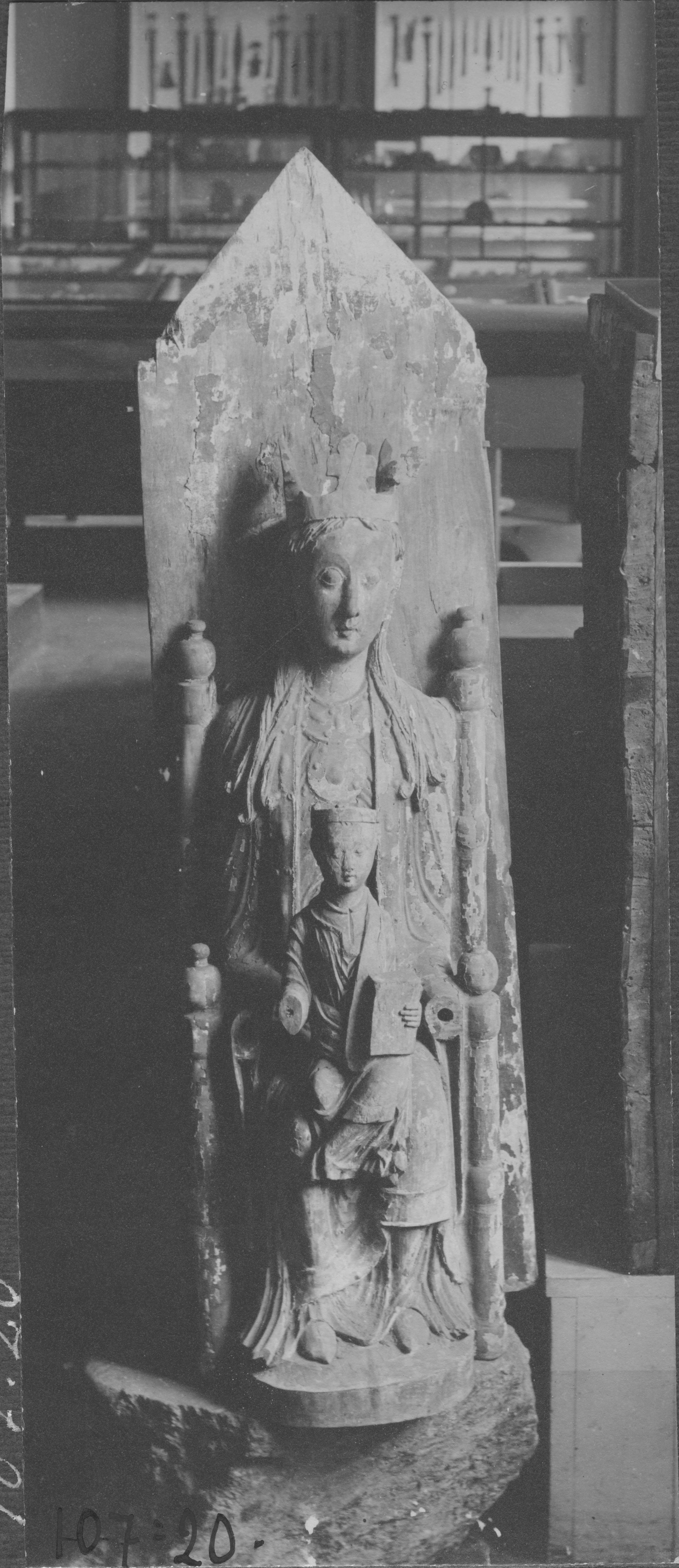 Beskrivning: Träskulptur föreställande Madonnan med barnet.