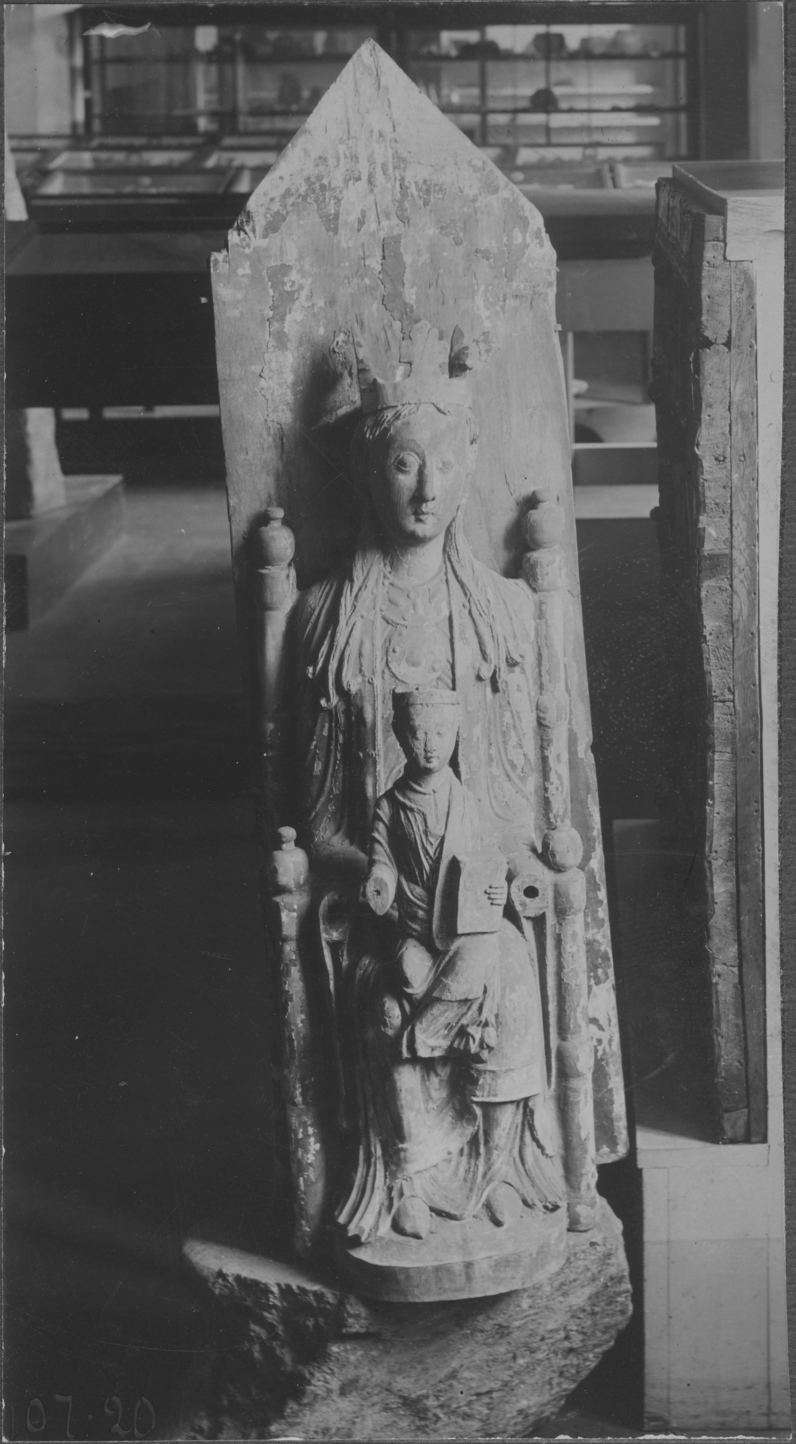 Beskrivning: Träskulptur föreställande Madonnan med barnet.
