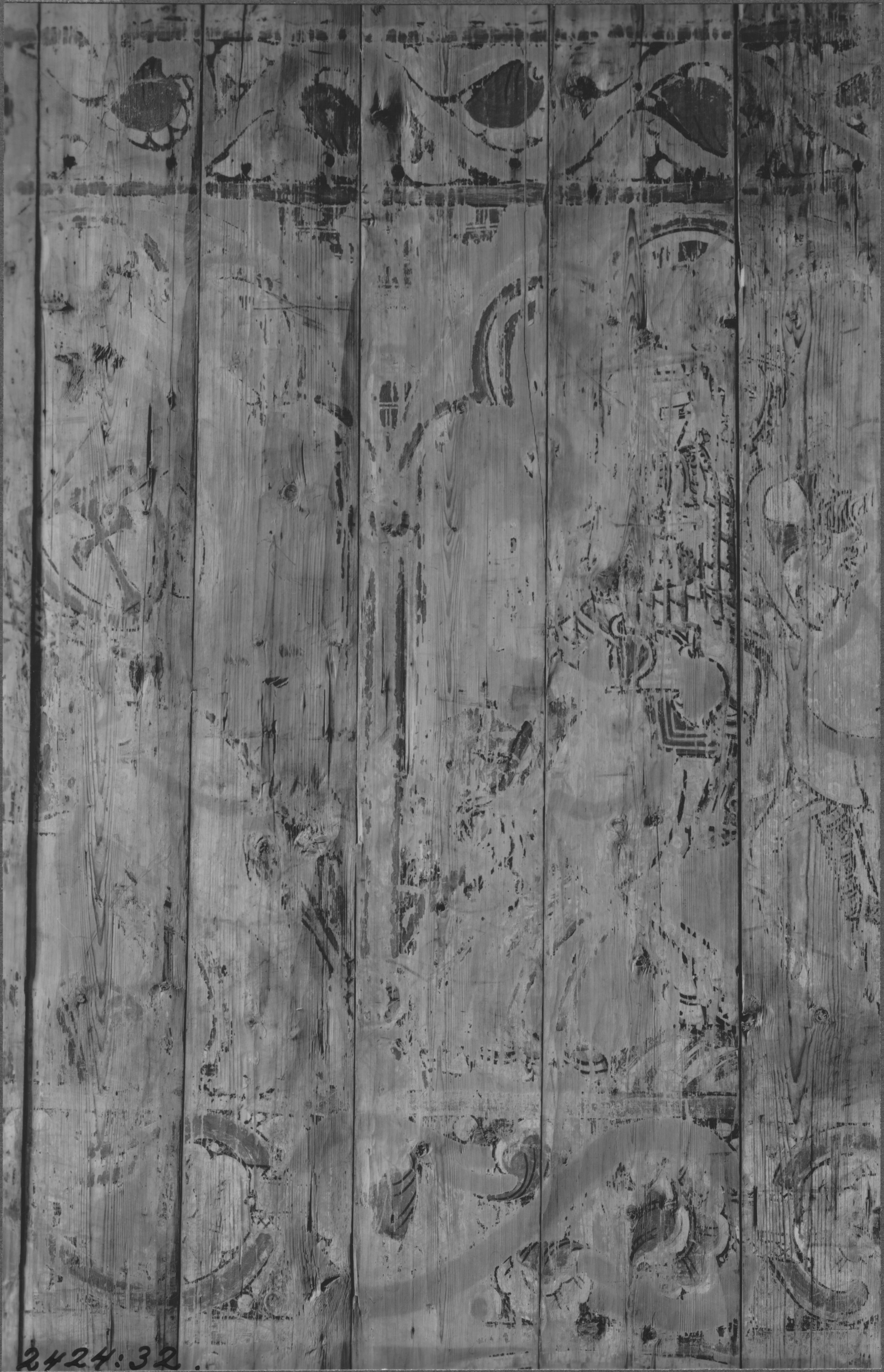 Beskrivning: Del av målad väggpanel. Helga kors saga. Kejsar Herakleios möter den persiske prinsen, hans blivande bundsförvant.
