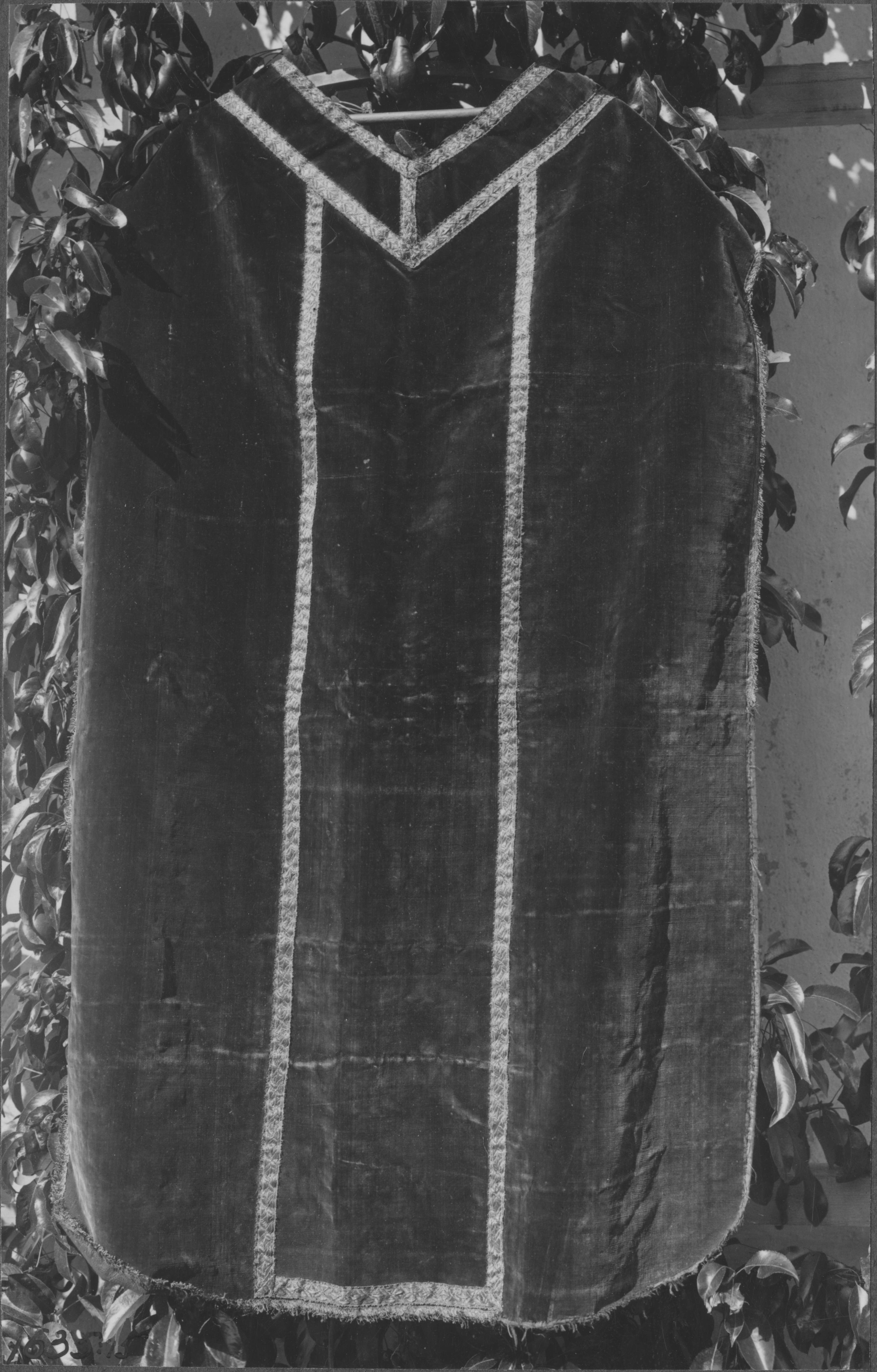 Beskrivning: Mässhake av röd sammet. Ryggstycket med bård av guldgalon. Kantad med smal guldgalon och frans. 1700-talet. Snabbinventering.