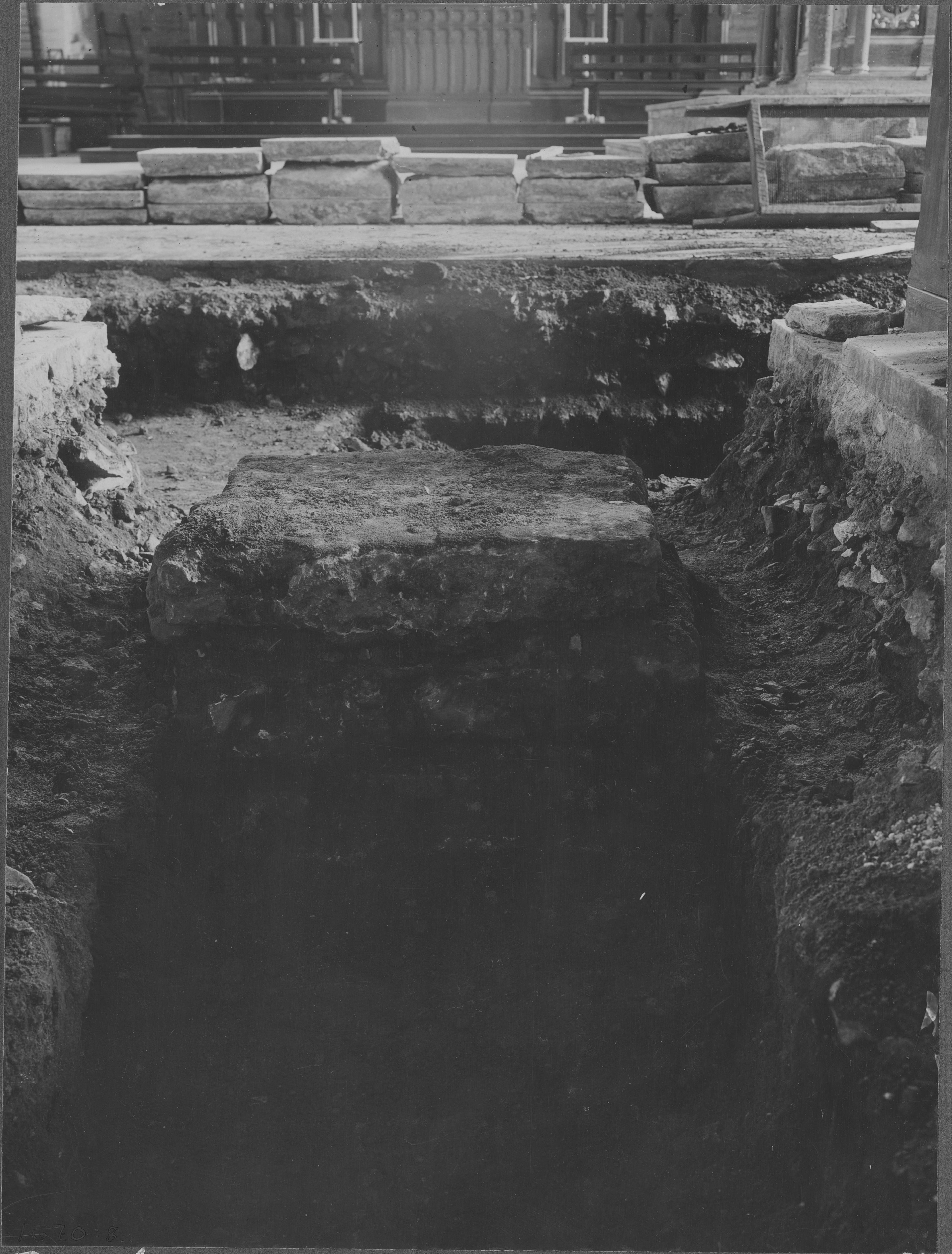 Beskrivning: Postament under golvet i östra delen av kyrkan.