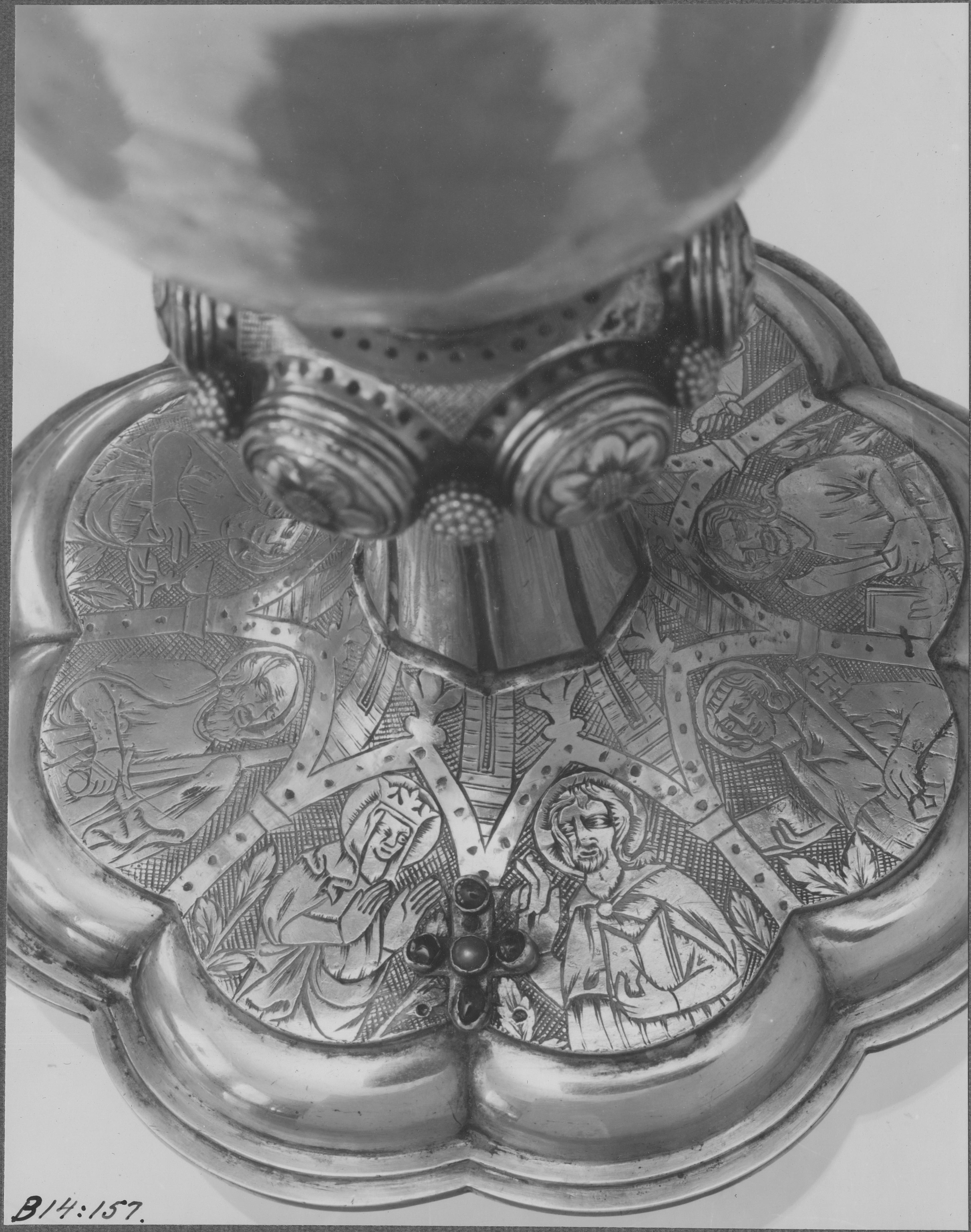 Beskrivning: Kalk av förgyllt silver från 1300-talet - skålen (cuppan) från 1748. Fotpartiet med graverade figurframställningar, Kristus, Maria och några av apostlarna.