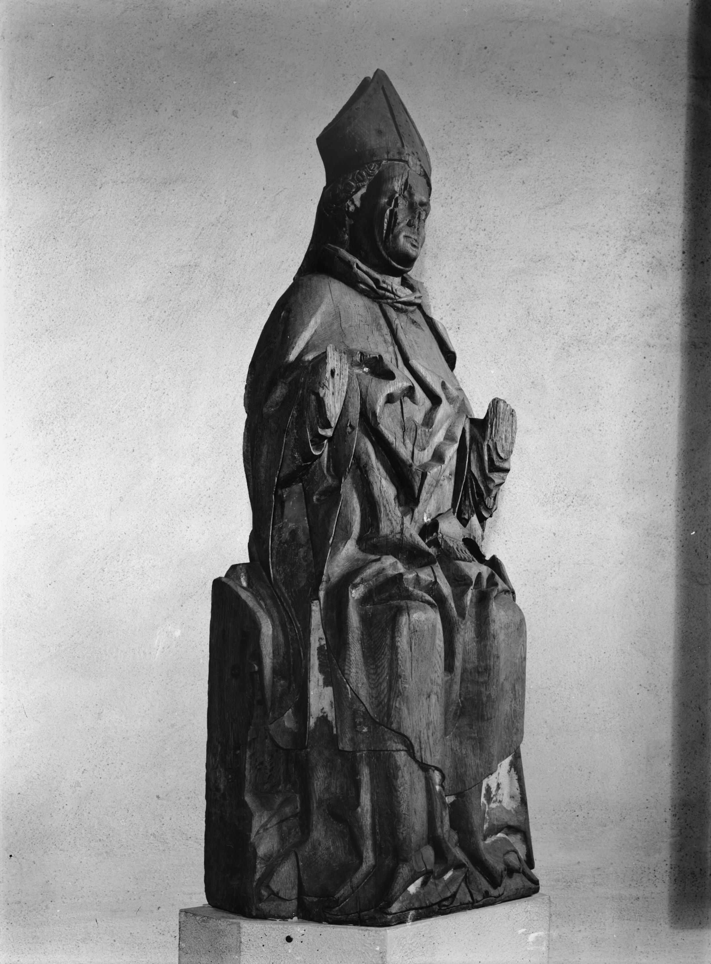 Beskrivning: Skulptur av trä föreställande en biskop. SHM inv 16153.