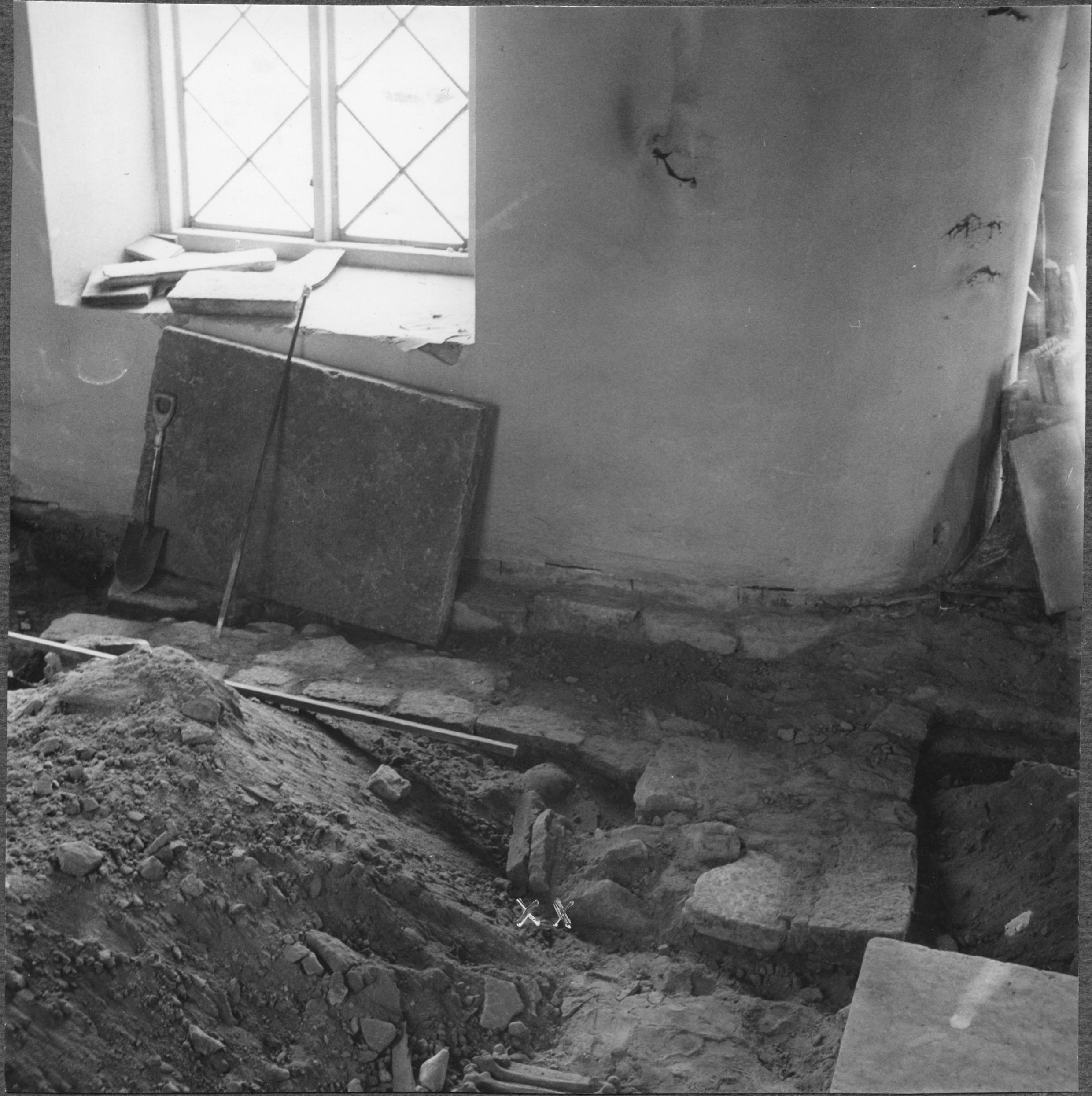 Beskrivning: Restaurering i kyrkan. Östtornets sydvästra hörn, triumfbågens södra vederlag samt ett stycke av långhusets södra mur.