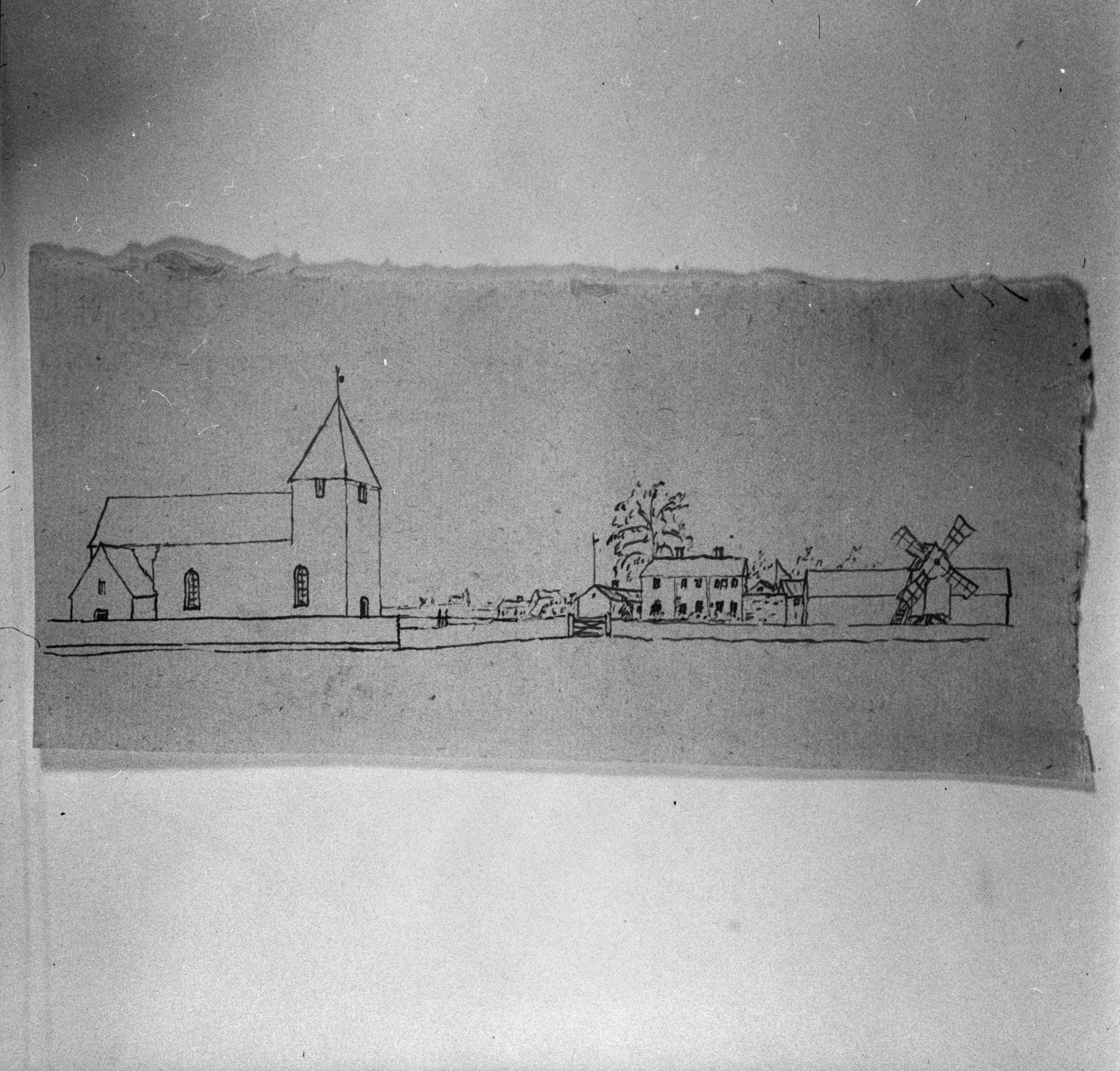 Beskrivning: Teckning av kyrkan och prästgården. Ur N. I. Löfgren, Samlingar och anteckningar till Ölands Historia och Beskrivning. ATA.