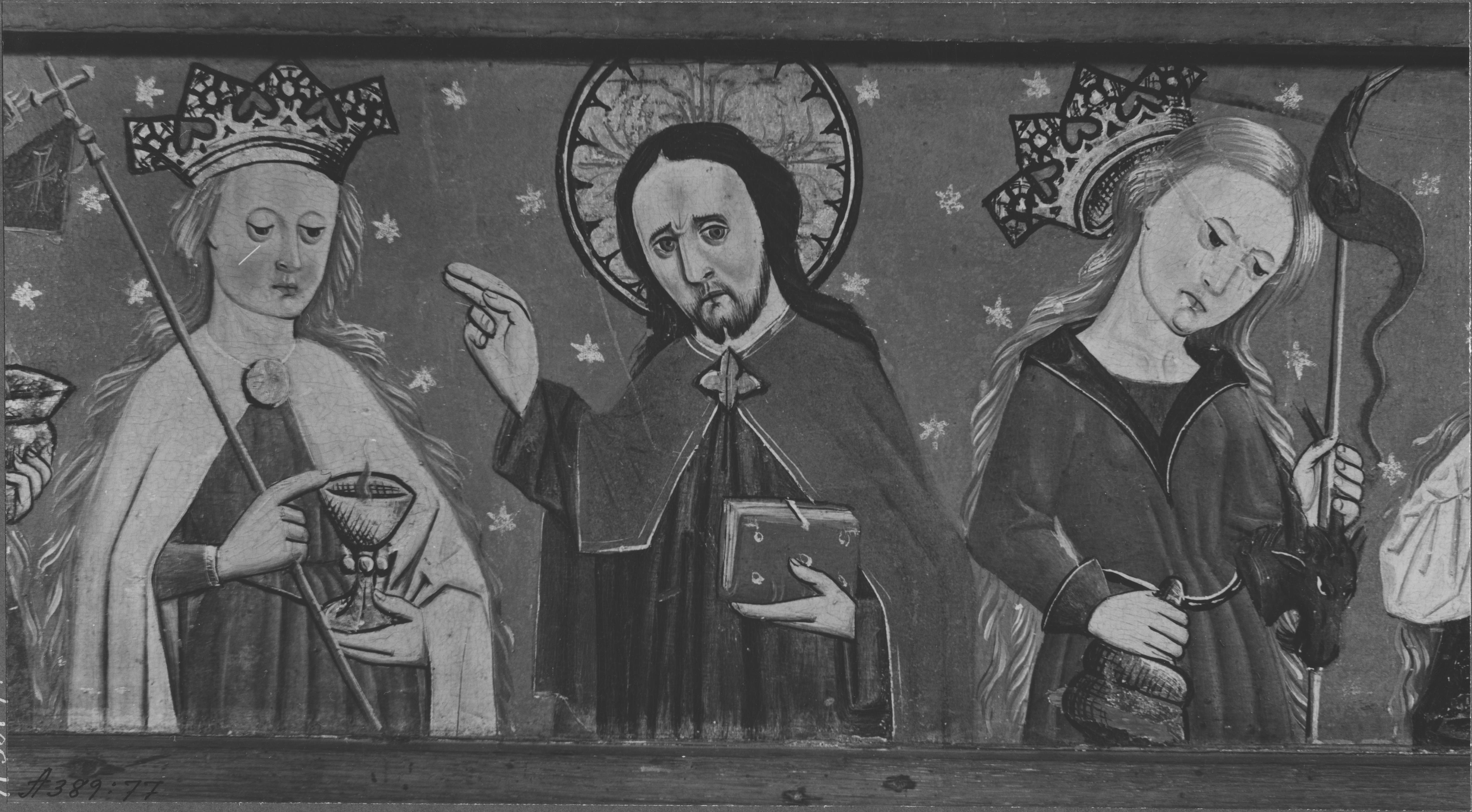 Beskrivning: Altarskåp, predellan med de visa och fåviska jungfrurna, detalj.