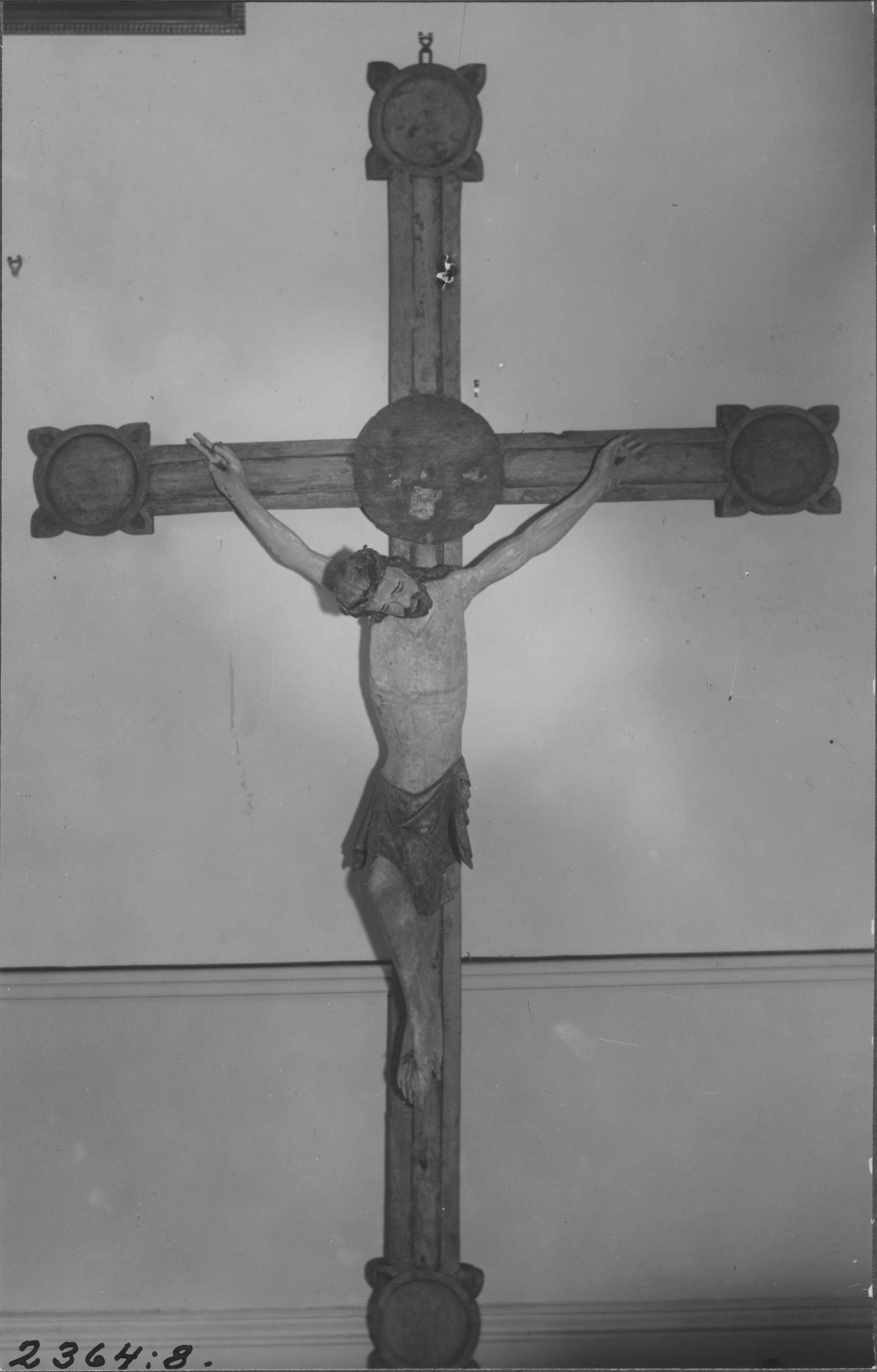 Beskrivning: Krucifix av lövträ från mitten av 1300-talet, efter konserveringen.