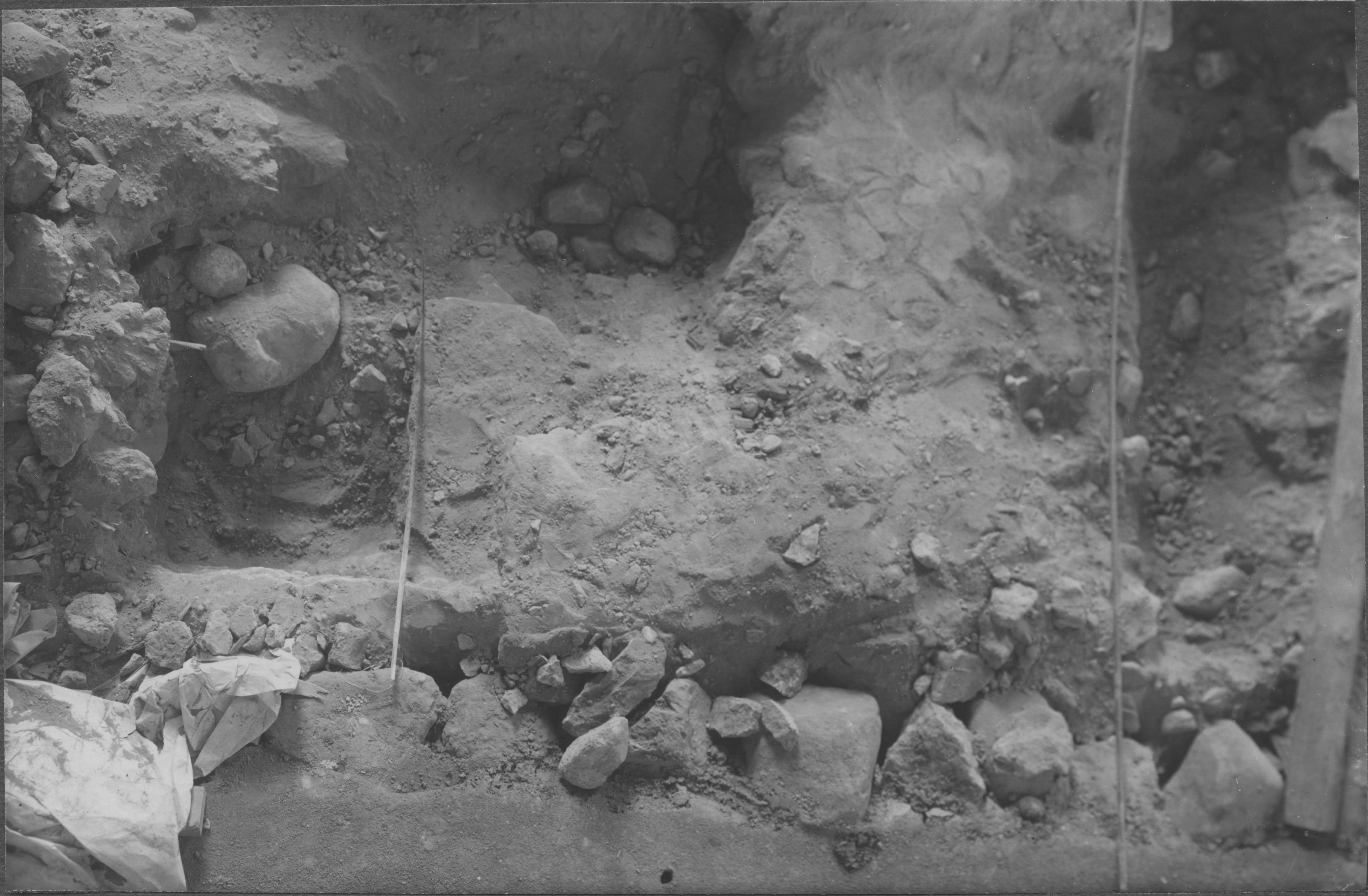 Beskrivning: Utgrävning i kyrkan. Norra delen av triumfbågsmuren (från predikstolen).