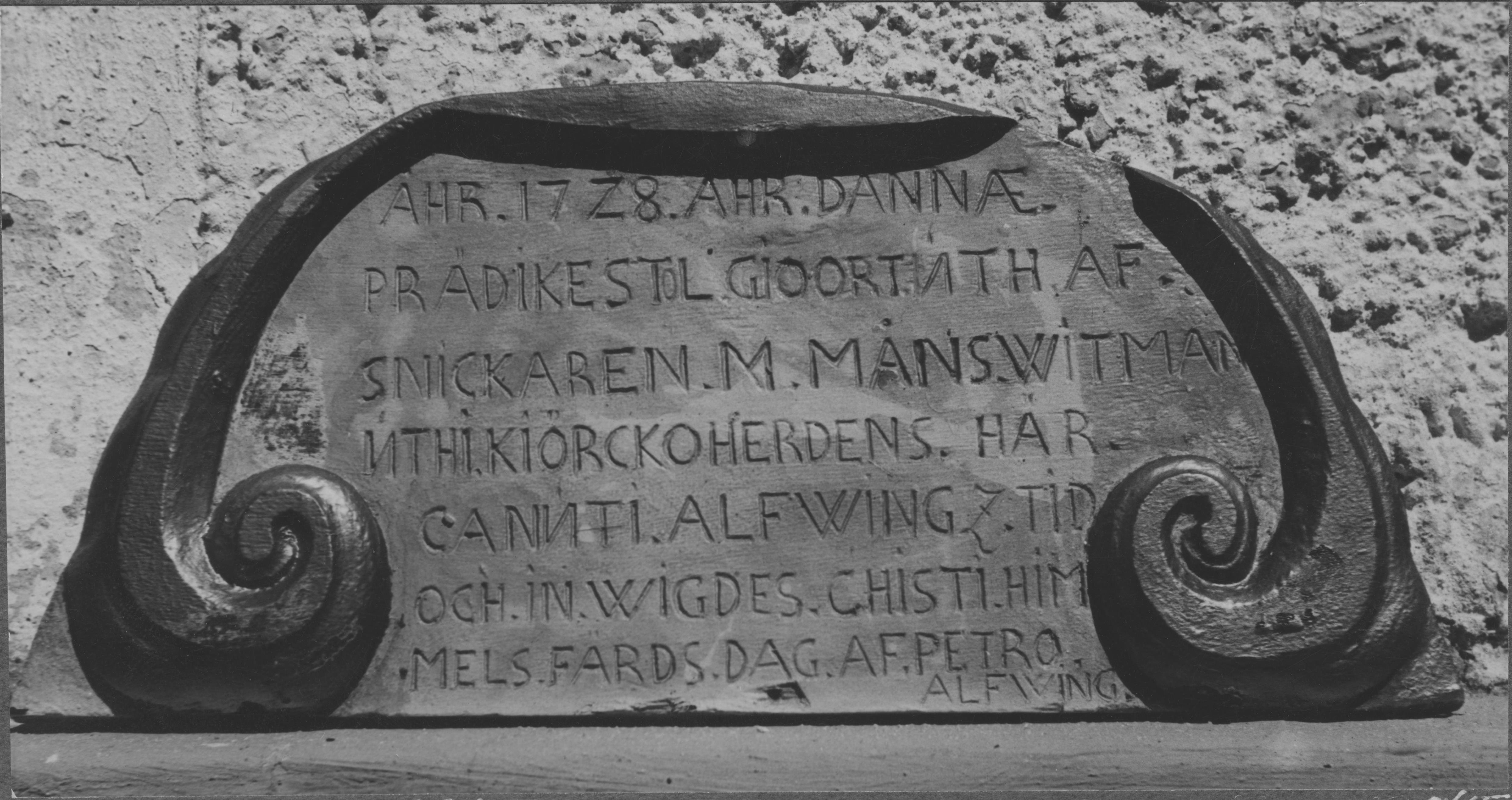 Beskrivning: Inskriftstavla på ljudtaket till predikstolen. Efter reastaurering.