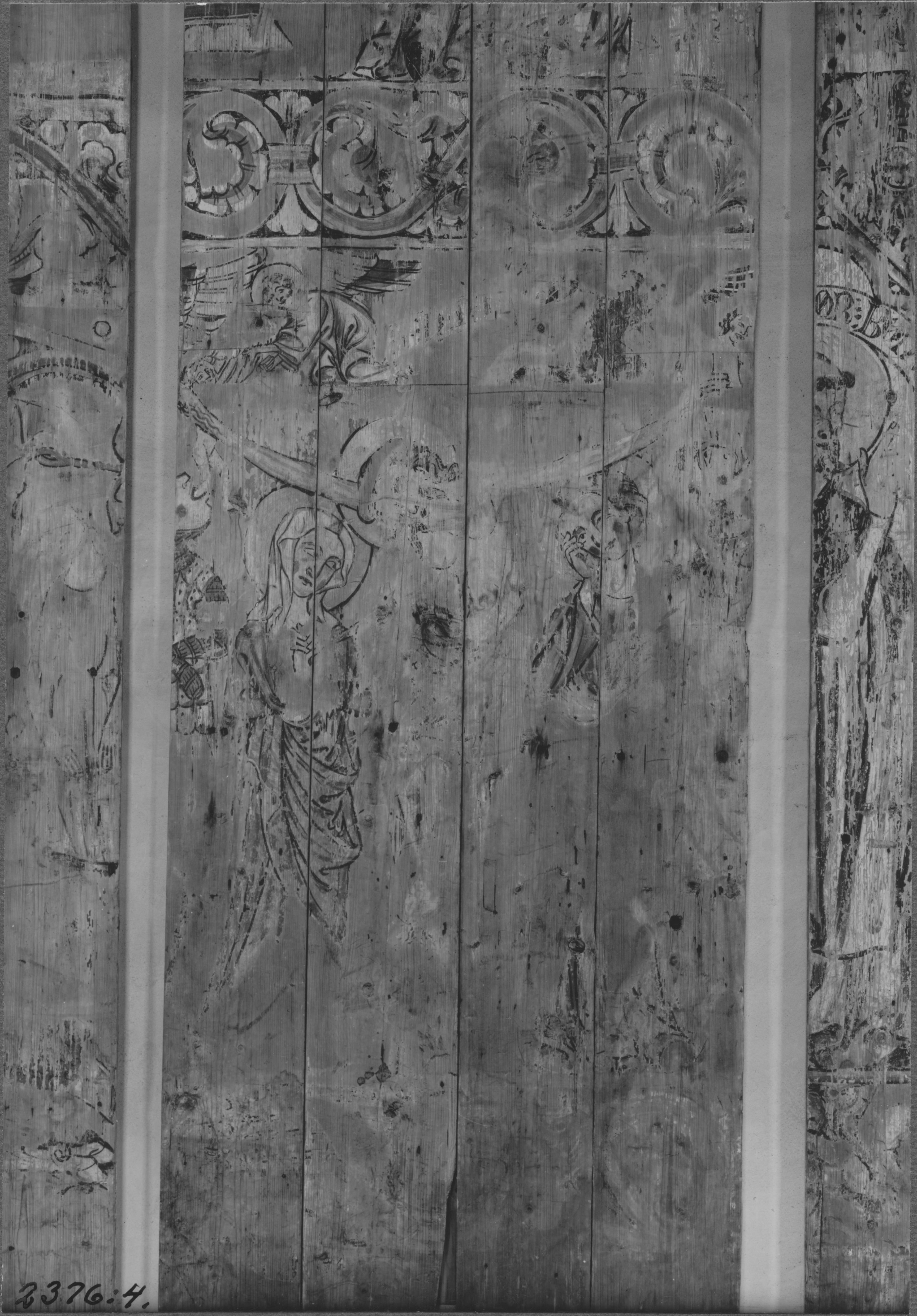 Beskrivning: Del av målad väggpanel. Thomas Beckets historia. En hängd räddas ur galgen. Korsfästelsen.