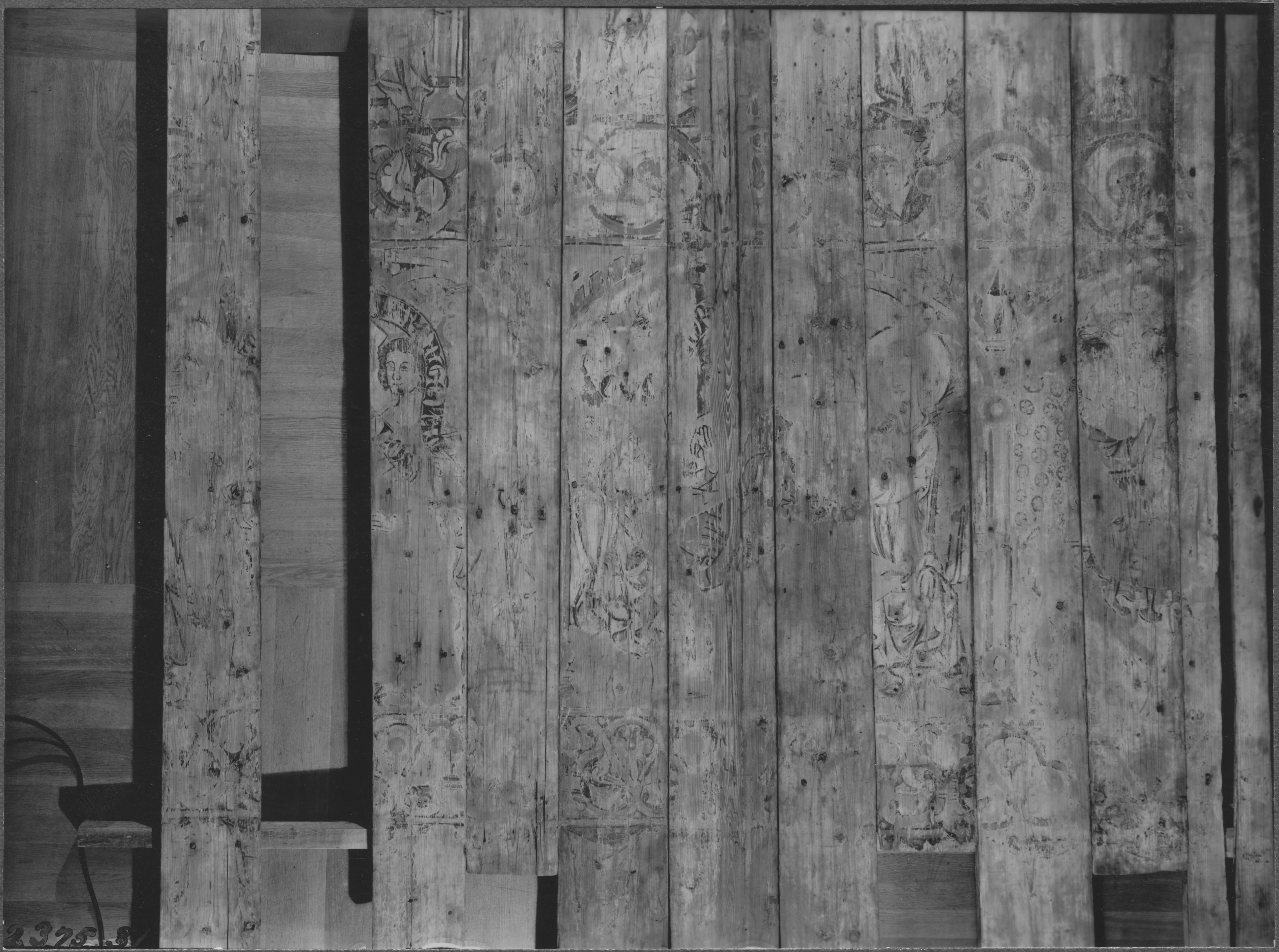 Beskrivning: Del av målad väggpanel. Thomas Beckets historia. Thomas landsflyktiga släktingar bönfaller honom om hjälp. Han ligger sjuk. Han flyr till Sens.